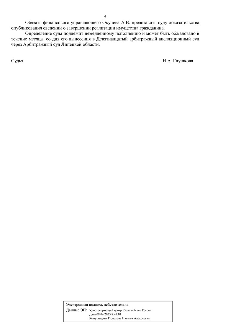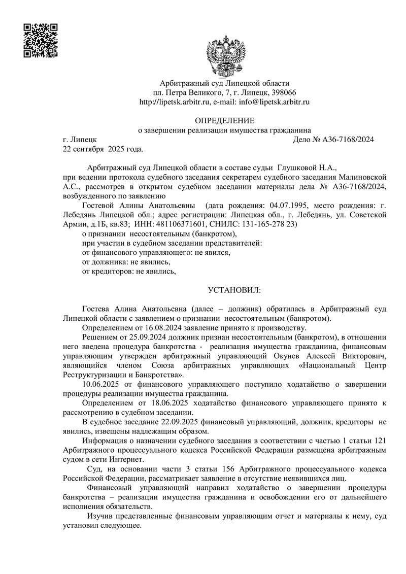 В сентябре 2025 года Арбитражный суд Липецкой области вынес определение о завершении процедуры реализации имущества по делу № А36-7168/2024, открытого в отношении жителя Липецкой области. Руководствуясь требованиями Федерального закона «О несостоятельности (банкротстве)», клиент нашей компании был признан банкротом и освобожден от всех обязательств перед кредиторами.