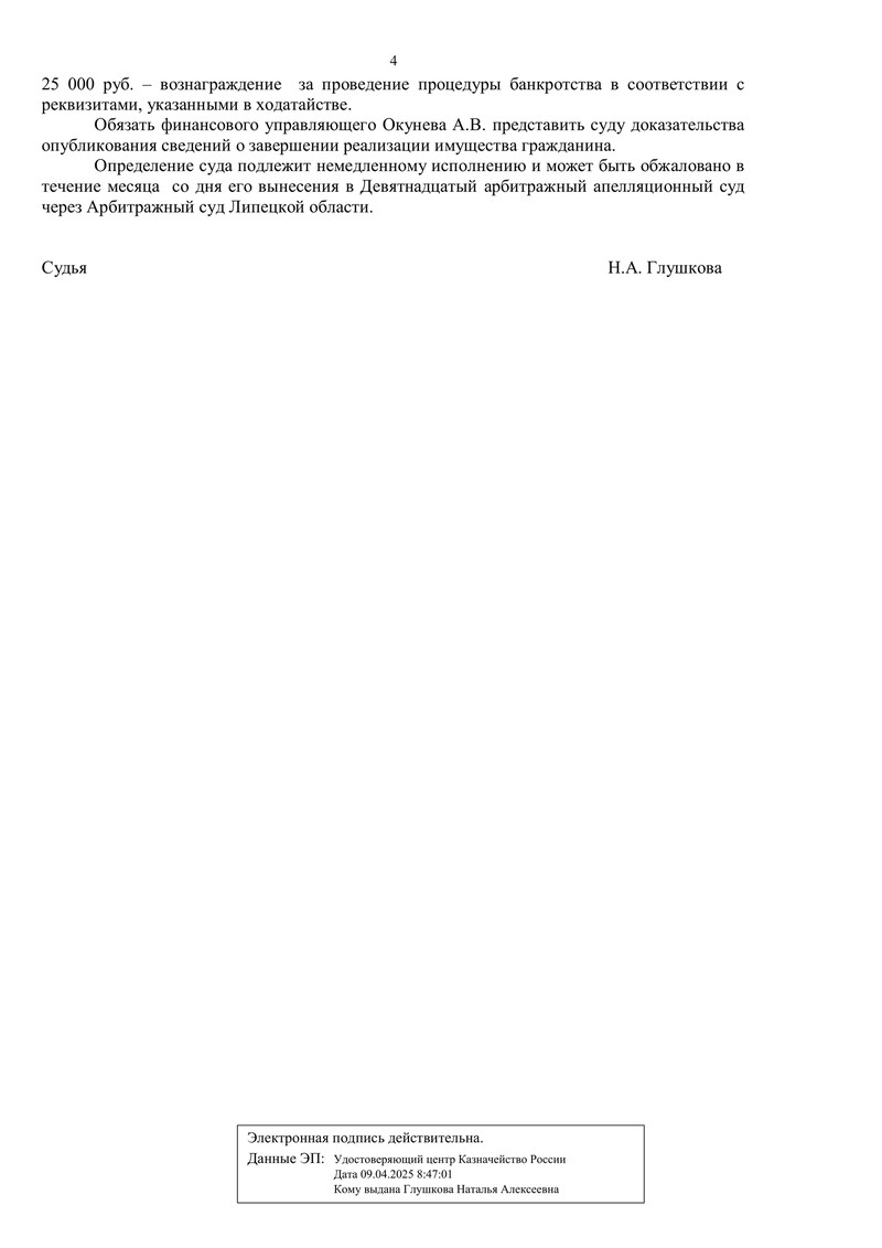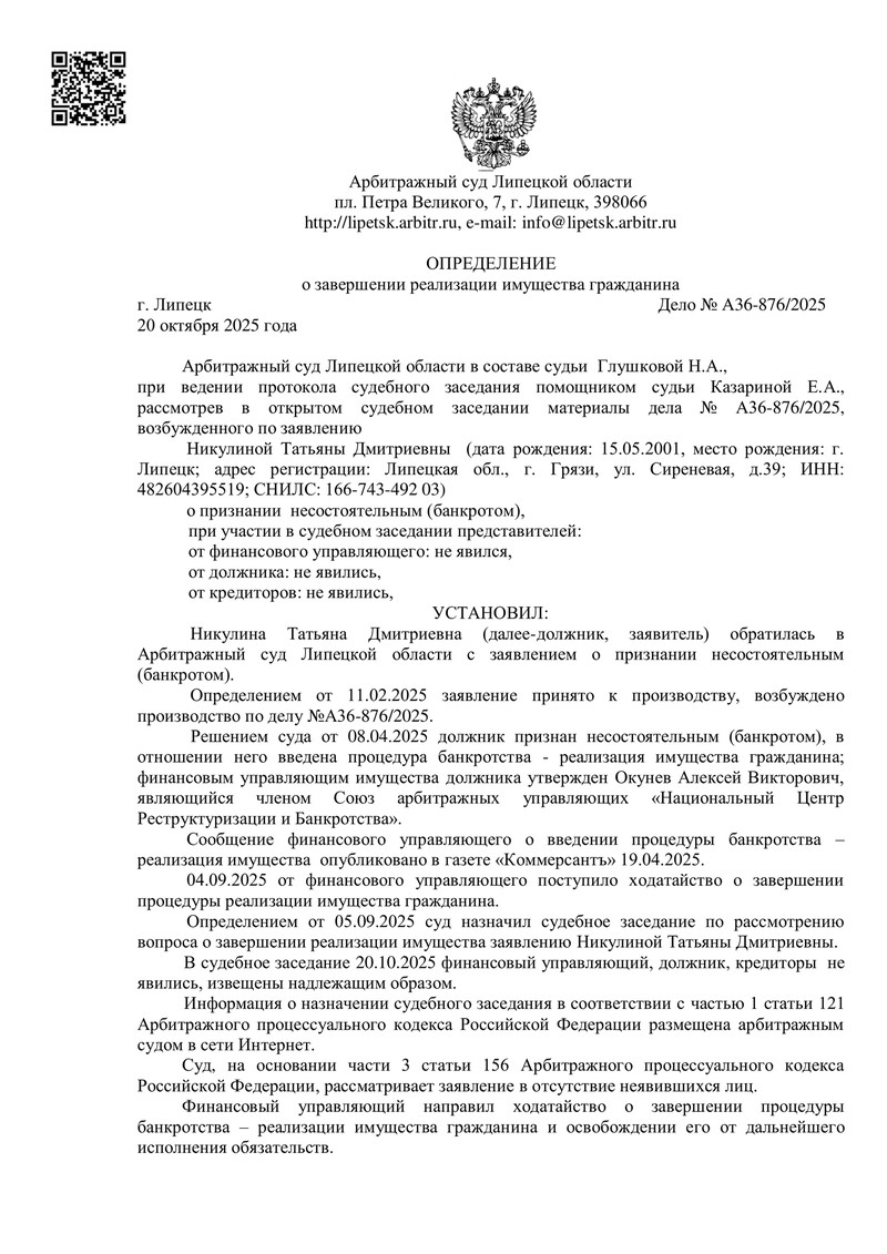 20 октября 2025 года в Арбитражном суде Липецкой области было вынесено определение о завершении реализации имущества по делу № А36-876/2025. Суд подтвердил законность процедуры банкротства и освободил нашего клиента от исполнения обязательств перед кредиторами.