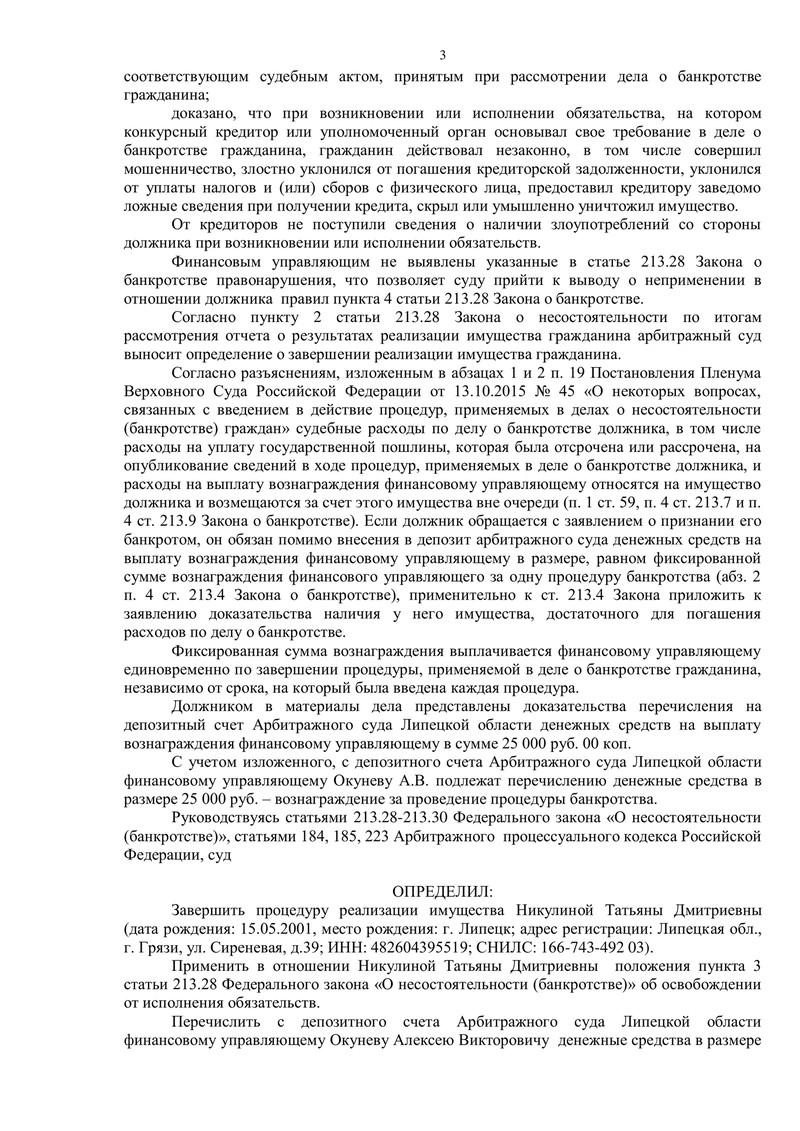 Итог: суд определил завершить процедуру реализации имущества и ОБЯЗАЛ применить к должнику положение о полном освобождении от исполнения обязательств по всем кредитам, возникшим до даты подачи заявления о банкротстве. Более того, освобождение распространяется даже на тех кредиторов, которые не успели заявиться в реестр!