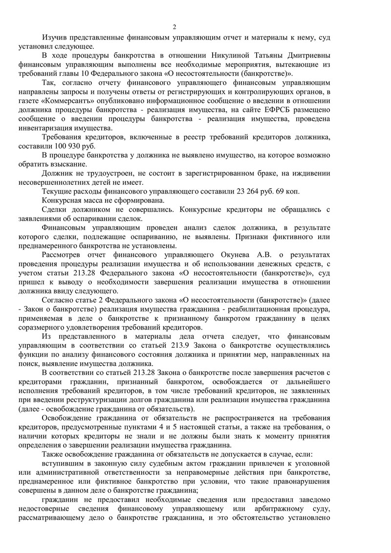 - Все требования закона соблюдены — суд пришёл к выводу об отсутствии оснований для отказа в освобождении от долгов.