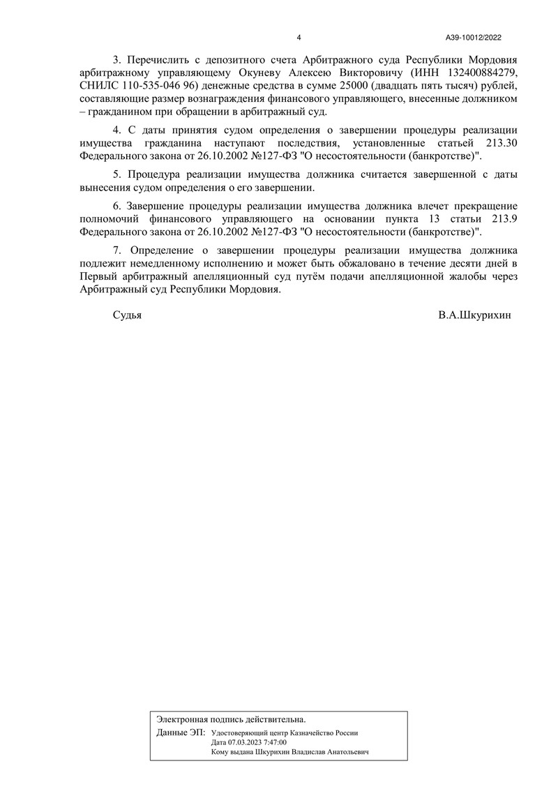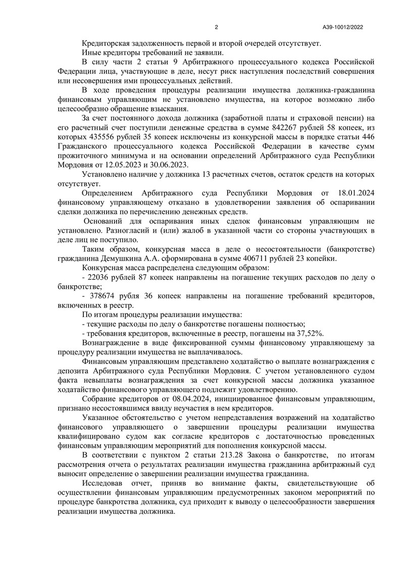 Отчёт финансового управляющего подтвердил успешное завершение процедуры реализации имущества должника. Благодаря слаженной работе специалистов компании "ДОЛГАМ.НЕТ" процедура банкротства прошла быстро и эффективно, что позволило освободить нашего клиента от долговой нагрузки и вернуть ему финансовую свободу. Все требования кредиторов, включая не заявленные при проведении процедуры реализации имущества, были признаны погашенными, и наш клиент был освобожден от дальнейших обязательств.