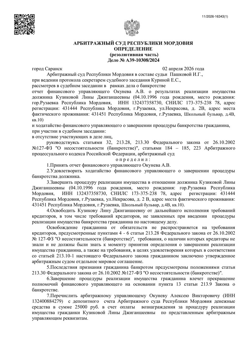 В Арбитражном суде Республики Мордовия завершилась процедура банкротства нашего клиента — еще одна история, в которой команда ДОЛГАМ.НЕТ помогла пройти все этапы законно, спокойно и с понятным результатом. Судебный акт вынесен 02 апреля 2026 года в городе Саранске, судья — И.Г. Пашкова.