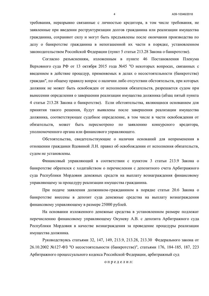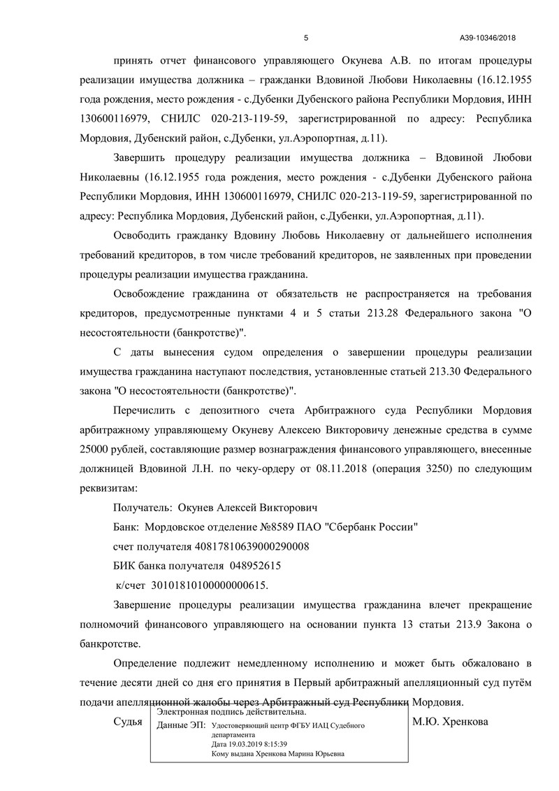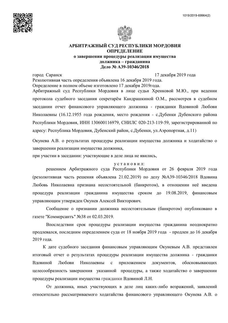 Арбитражный суд Республики Мордовия завершил процедуру реализации имущества клиента компании "ДОЛГАМ.НЕТ", предоставив ему возможность начать новую финансовую жизнь без долгов. Решение Арбитражного суда по делу №А39-10346/2018, озвученное 16 декабря 2019 года, официально вступило в силу на следующий день. Судья постановила, что все обязательства перед кредиторами, в том числе и те, которые не были заявлены в ходе процесса, считаются погашенными.