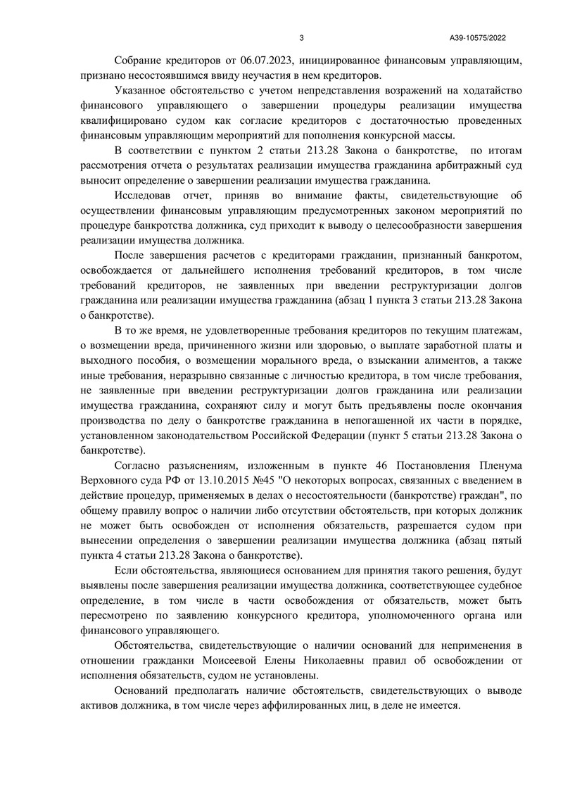 Финансовый управляющий подготовив итоговый отчет и приложив все необходимые документы, ходатайствовал о завершении процедуры. Надо отметить, что заседание шло в напряженном ритме и было приостановлено с 22 по 29 августа 2023 года. Несмотря на это, все стороны процесса активно взаимодействовали, что способствовало положительному решению суда.