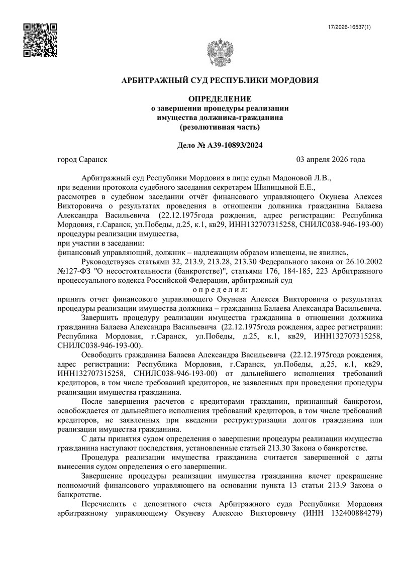 Практический итог для клиента ДОЛГАМ.НЕТ: дело № А39-10893/2024 завершено, процедура реализации имущества окончена, а долговая нагрузка, которая мешала нормальной жизни, снята в законном порядке. Именно за таким результатом к нам и обращаются: пройти банкротство корректно, с соблюдением всех требований закона и с финальным судебным актом, который закрепляет освобождение от долгов.