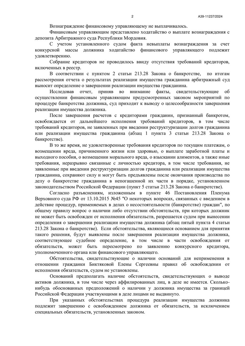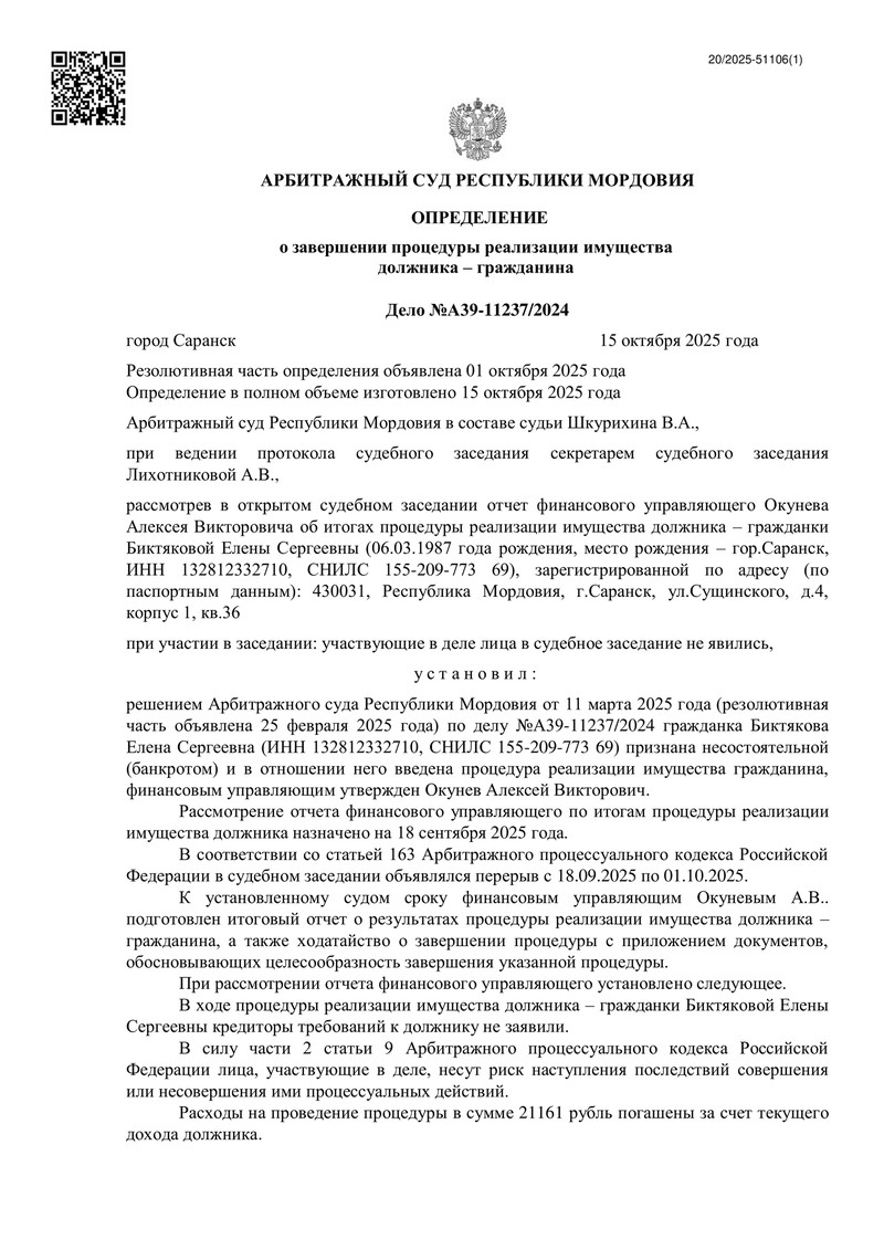 Арбитражный суд Республики Мордовия завершил процедуру банкротства физического лица по делу №А39-11237/2024. Несмотря на сложное финансовое положение наш клиент смог начать финансовую жизнь с чистого листа, полностью освободившись от дальнейшего исполнения требований кредиторов!