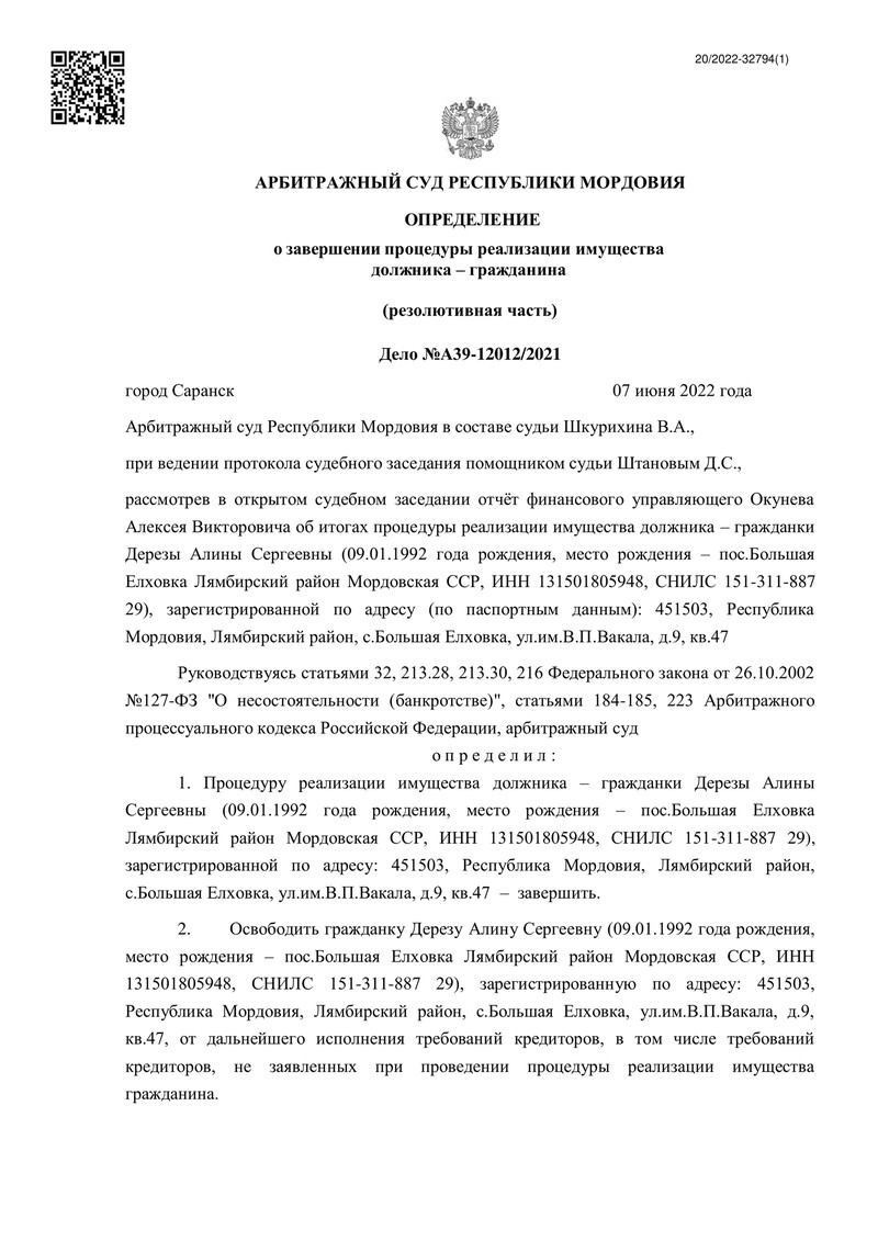 Еще один клиент компании "ДОЛГАМ.НЕТ" смог избавиться от долгового бремени благодаря успешно проведенной процедуре банкротства! Арбитражный суд Республики Мордовия вынес определение о завершении процедуры реализации имущества гражданина.