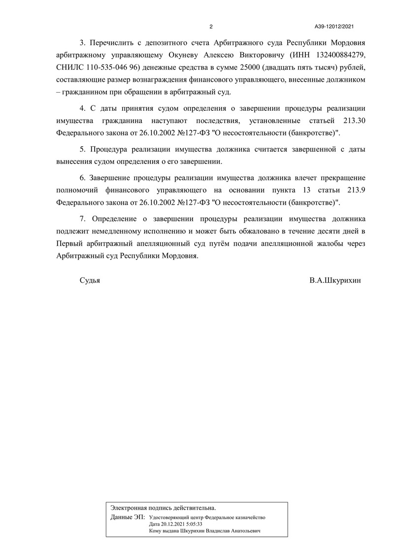 Дело №А39-12012/2021 было рассмотрено судом 7 июня 2022 года. В процессе были учтены все требования Федерального закона №127-ФЗ "О несостоятельности (банкротстве)" и Арбитражного процессуального кодекса Российской Федерации.