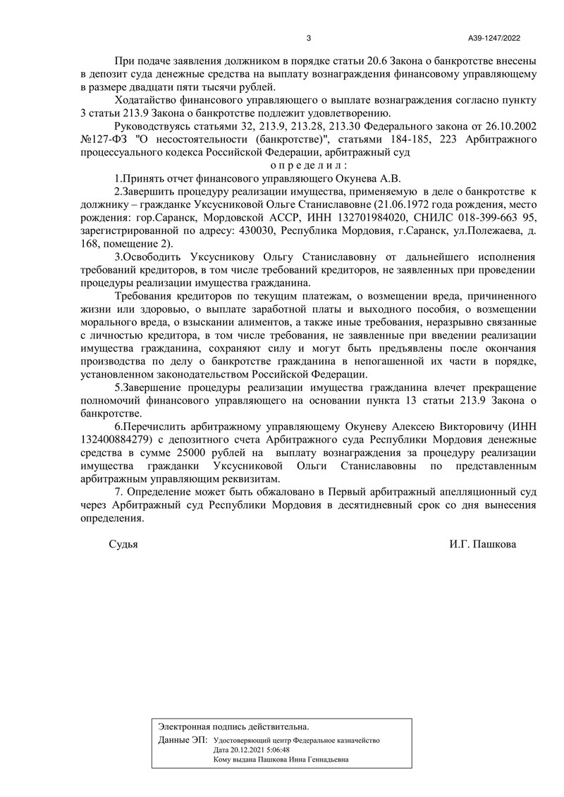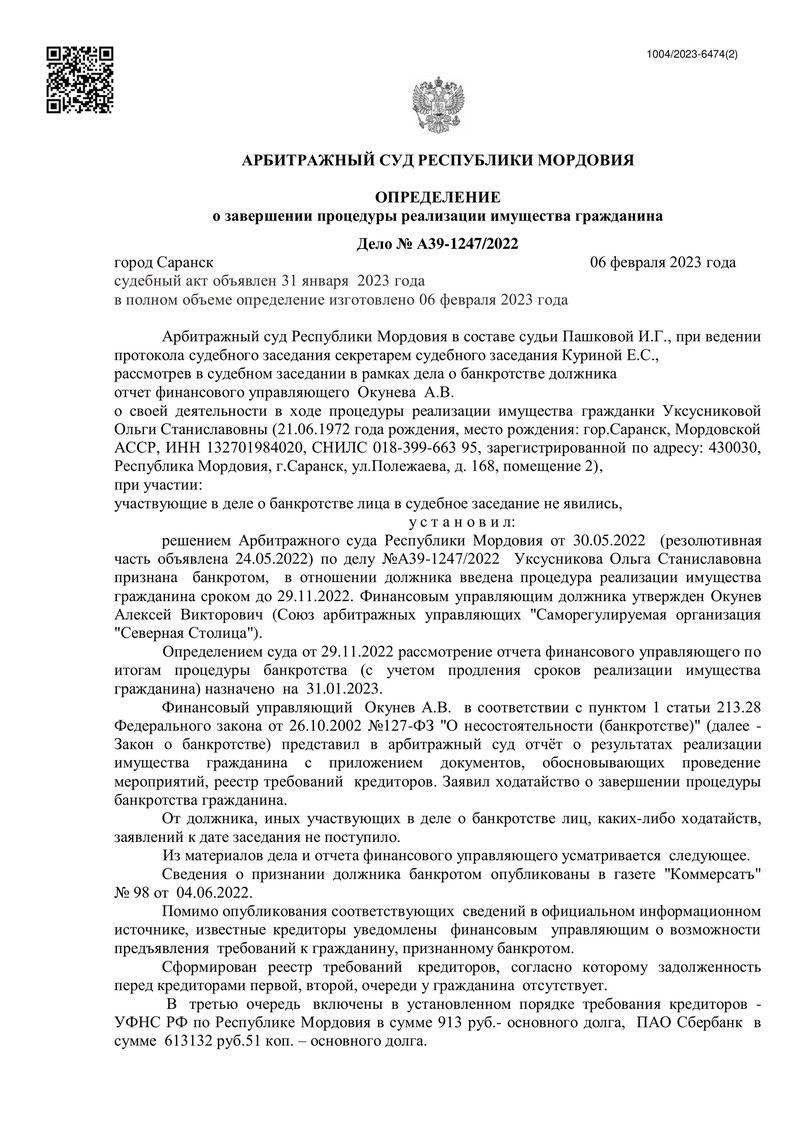 Очередной дело компании "ДОЛГАМ.НЕТ" завершилось победой! Арбитражный суд Республики Мордовия удовлетворил ходатайство о завершении процедуры реализации имущества нашего клиента и освободил его от долгов. Судебное заседание состоялось 31 января 2023 года, а итоговое определение было изготовлено 6 февраля 2023 года.
