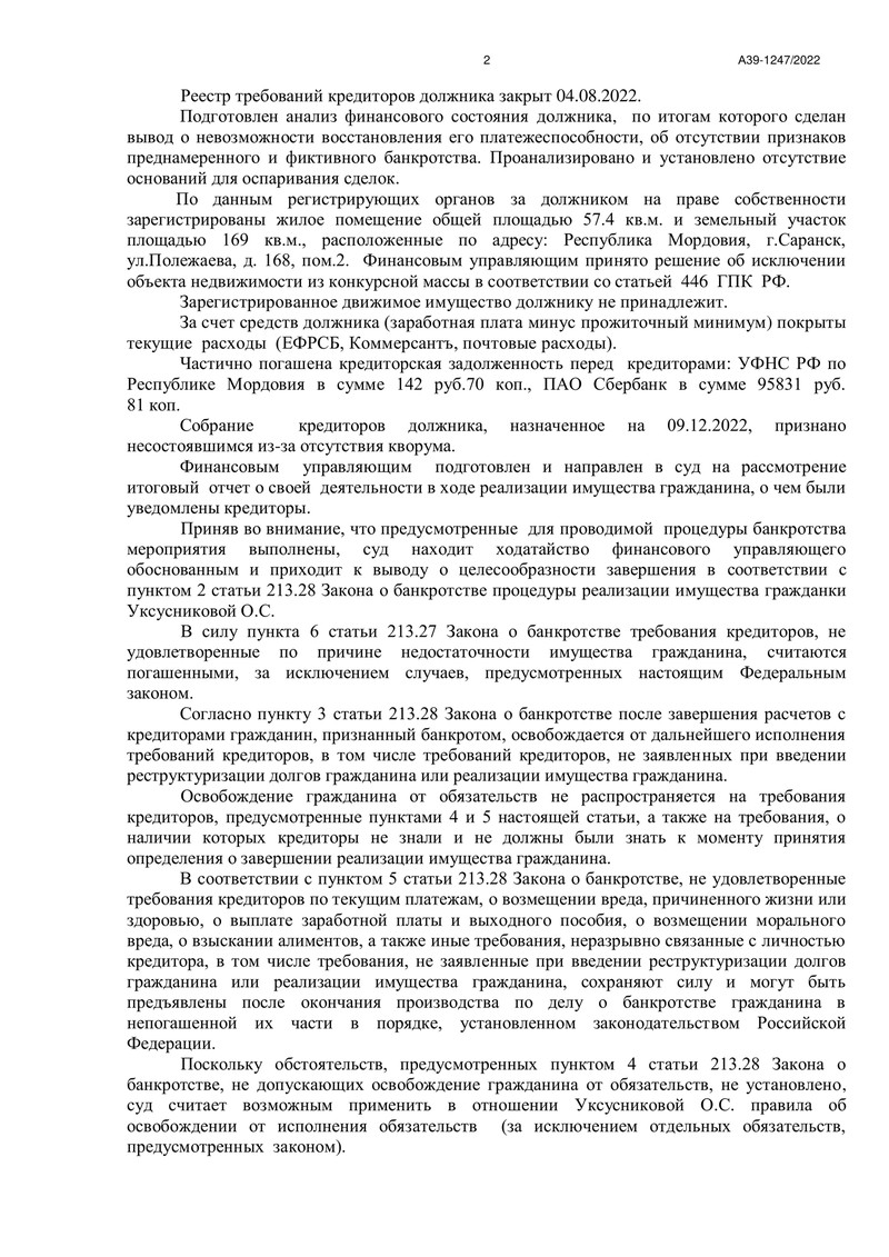 Процедура банкротства началась 30 мая 2022 года, когда должник был признан банкротом и началась процедура реализации имущества. В ходе процедуры финансовый управляющий сформировал реестр требований кредиторов. Задолженность включала требования УФНС РФ по Республике Мордовия на сумму 913 рублей и ПАО "Сбербанк" на сумму 613 132 рубля 51 копейку. Реестр кредиторов был закрыт 4 августа 2022 года.