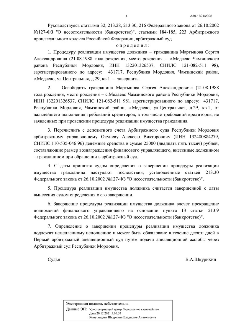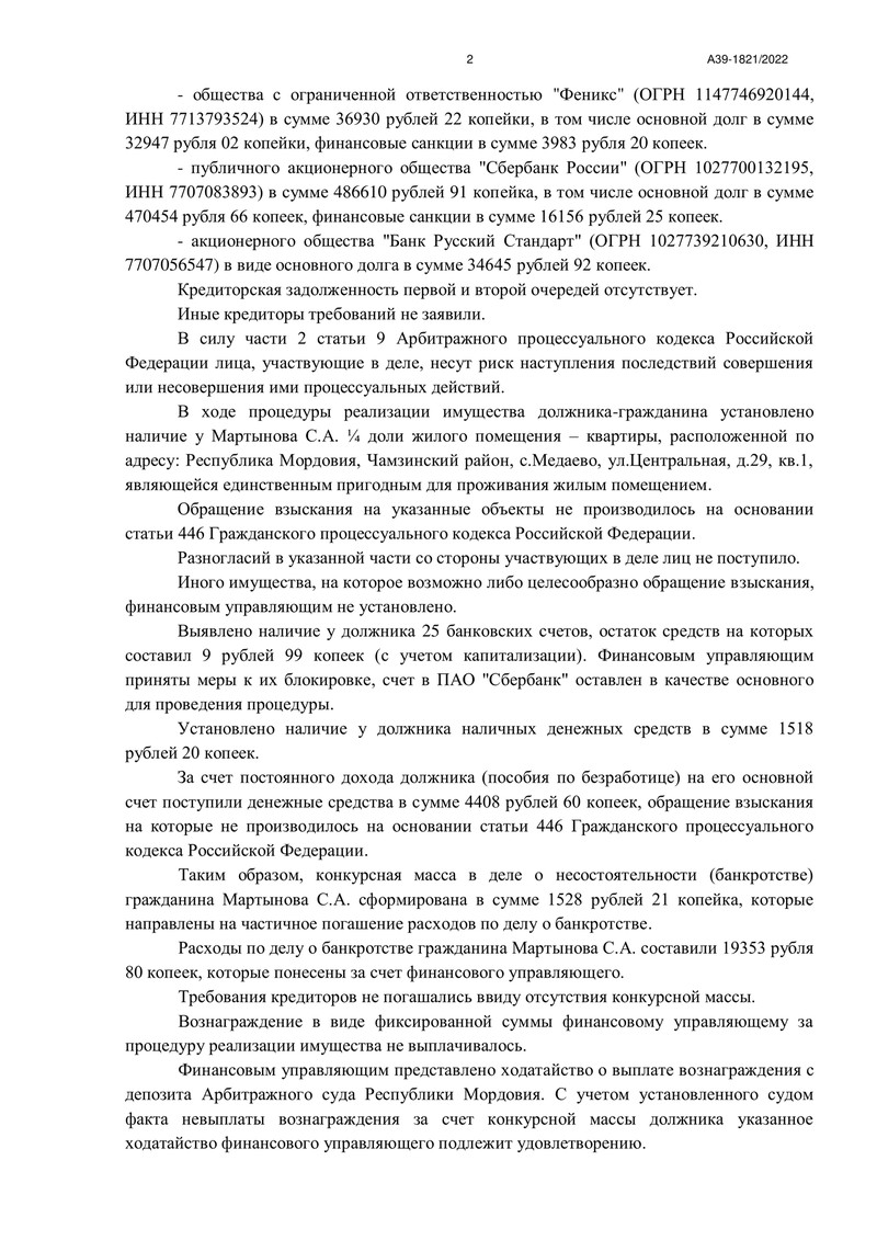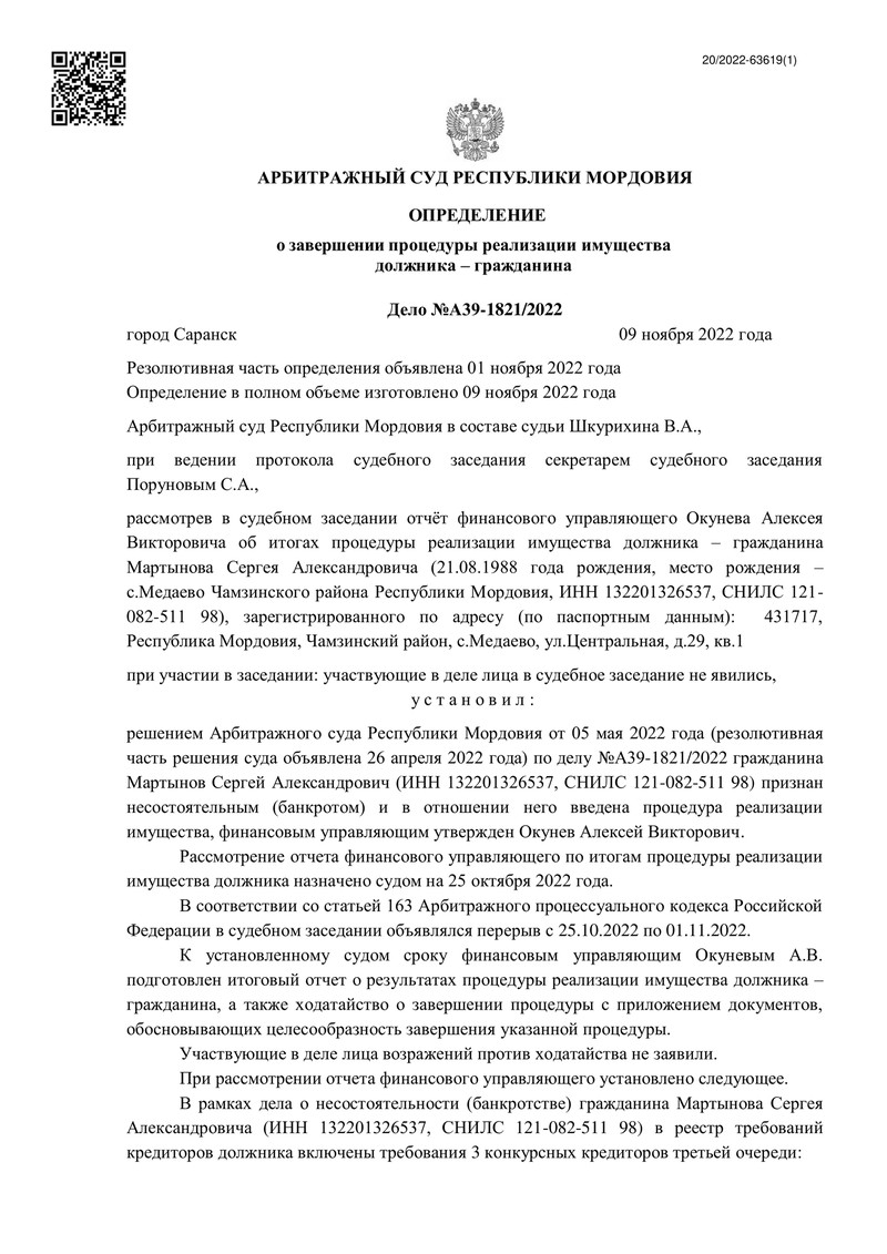 Новая победа компании "ДОЛГАМ.НЕТ" в Арбитражном суде Республики Мордовия принесла нашему клиенту финансовую свободу. По делу №А39-1821/2022 было вынесено определение о завершении процедуры реализации имущества.