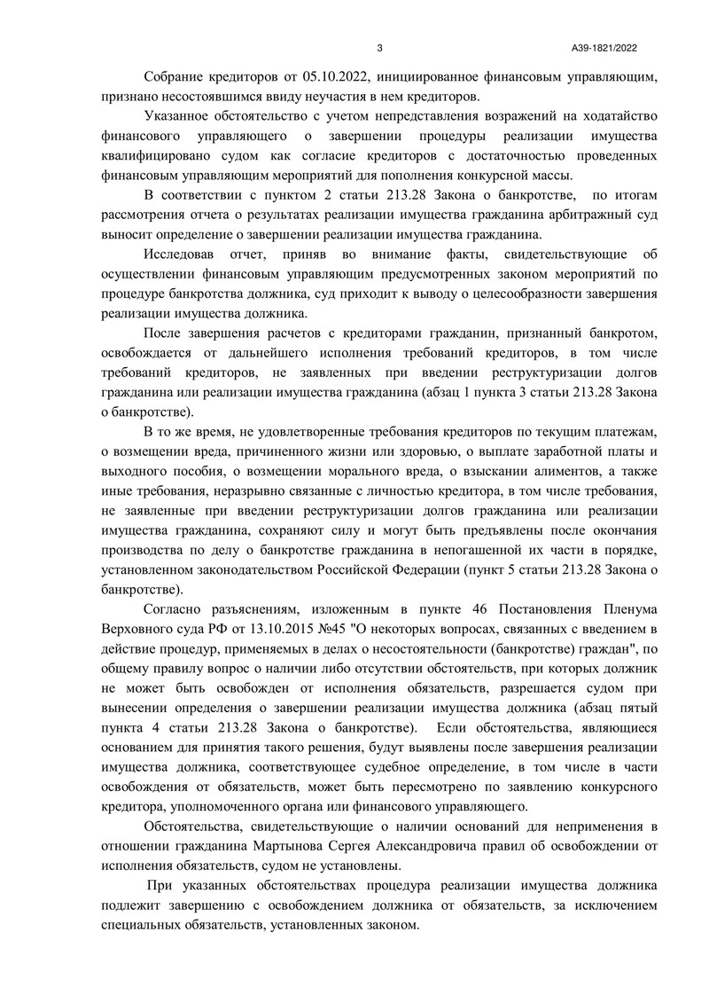 1 ноября 2022 года на судебном заседании рассматривался отчет финансового управляющего. Судом было принято решение завершить процедуру, освободив тем самым нашего клиента, от долговых обязательств перед кредиторами.