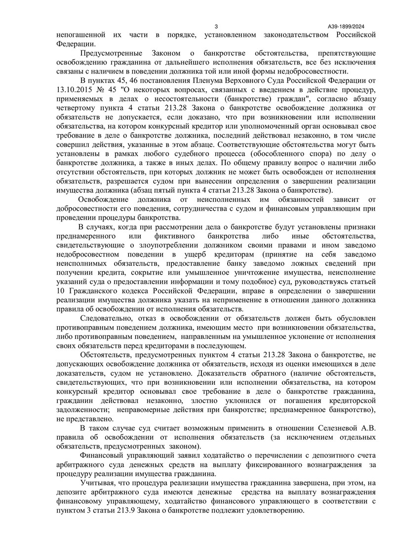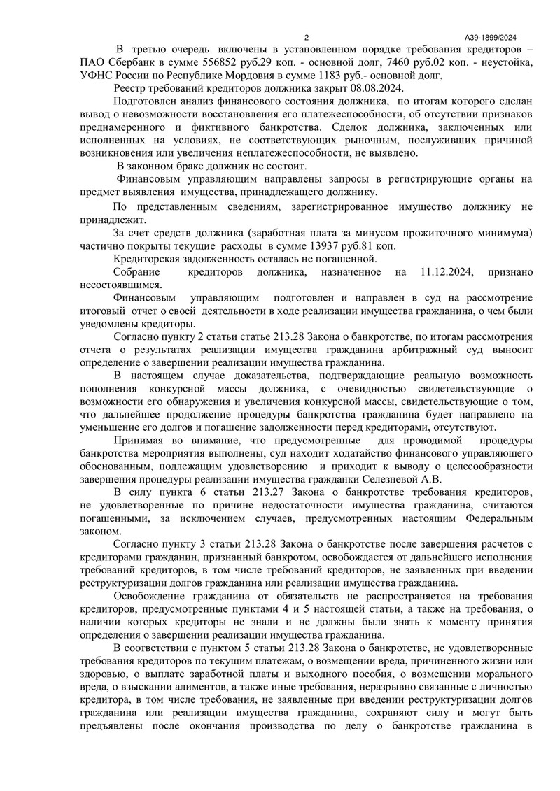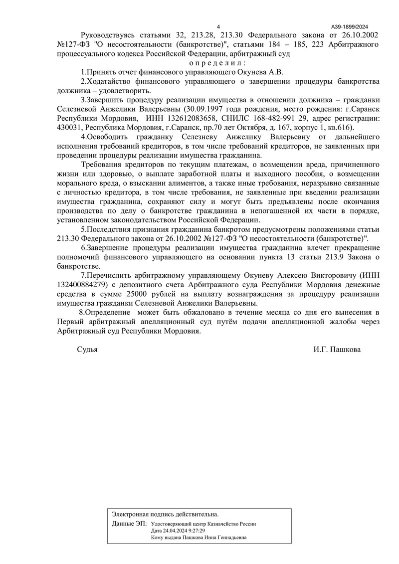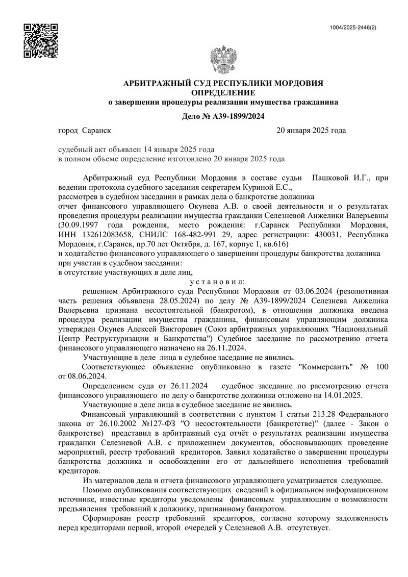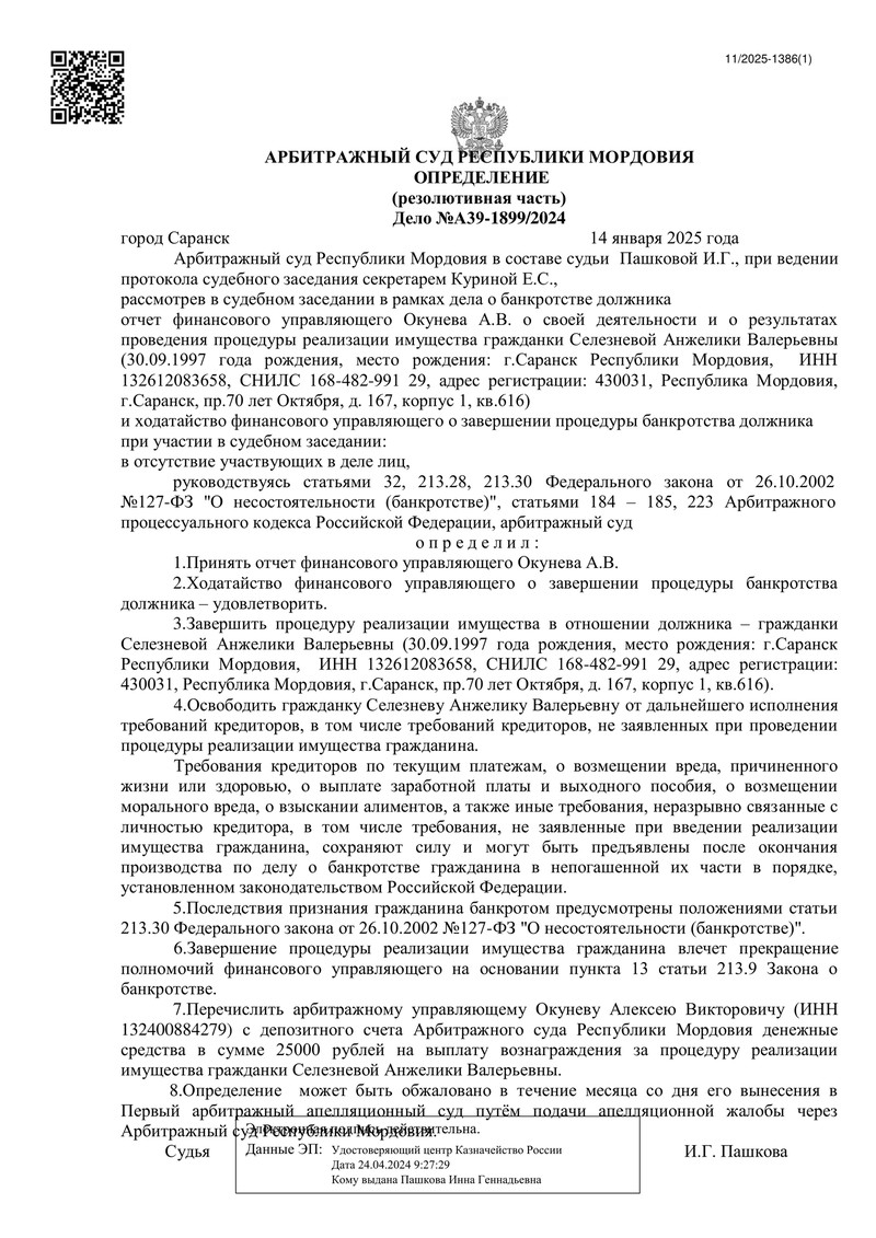 Финальное судебное заседание по делу №А39-1899/2024 состоялось 14 января 2025 года. Финансовый управляющий представил суду отчет о результатах проведения процедуры реализации имущества должника. Итогом дела стало определение суда о завершении процедуры банкротства и полном освобождении клиента от исполнения обязательств перед кредиторами.