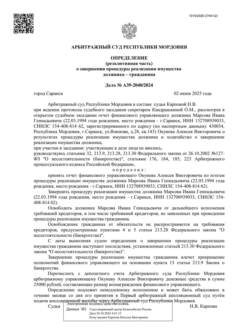 В июне 2025 года Арбитражный суд Республики Мордовия поставил точку в деле №А39-2040/2024. Процедура банкротства проходила строго по нормам Федерального закона №127-ФЗ "О несостоятельности (банкротстве)" и принесла нашему клиенту финансовую свободу.