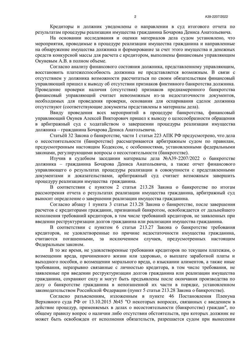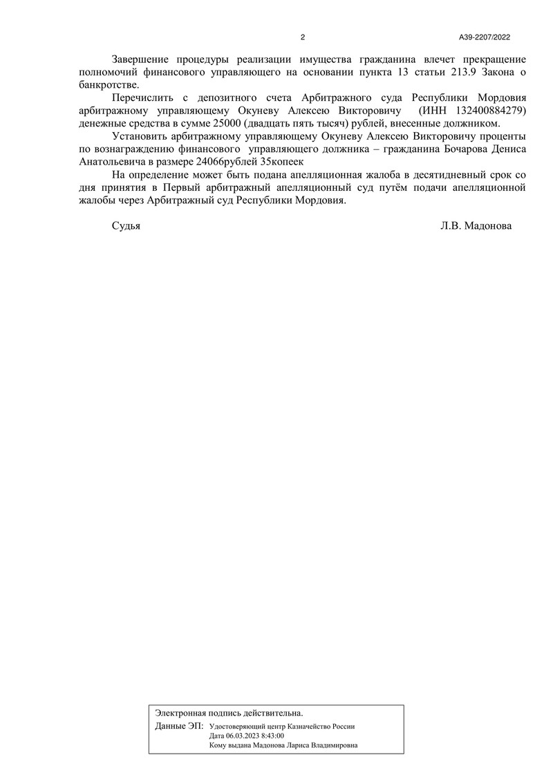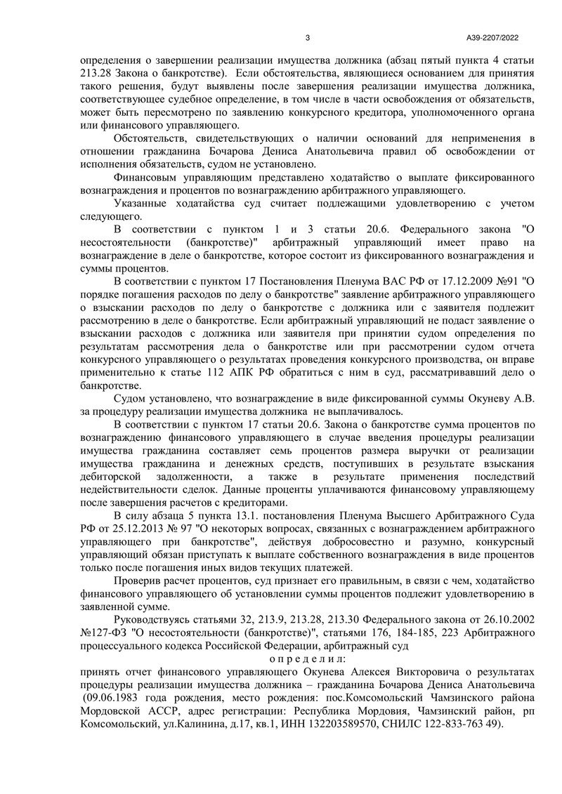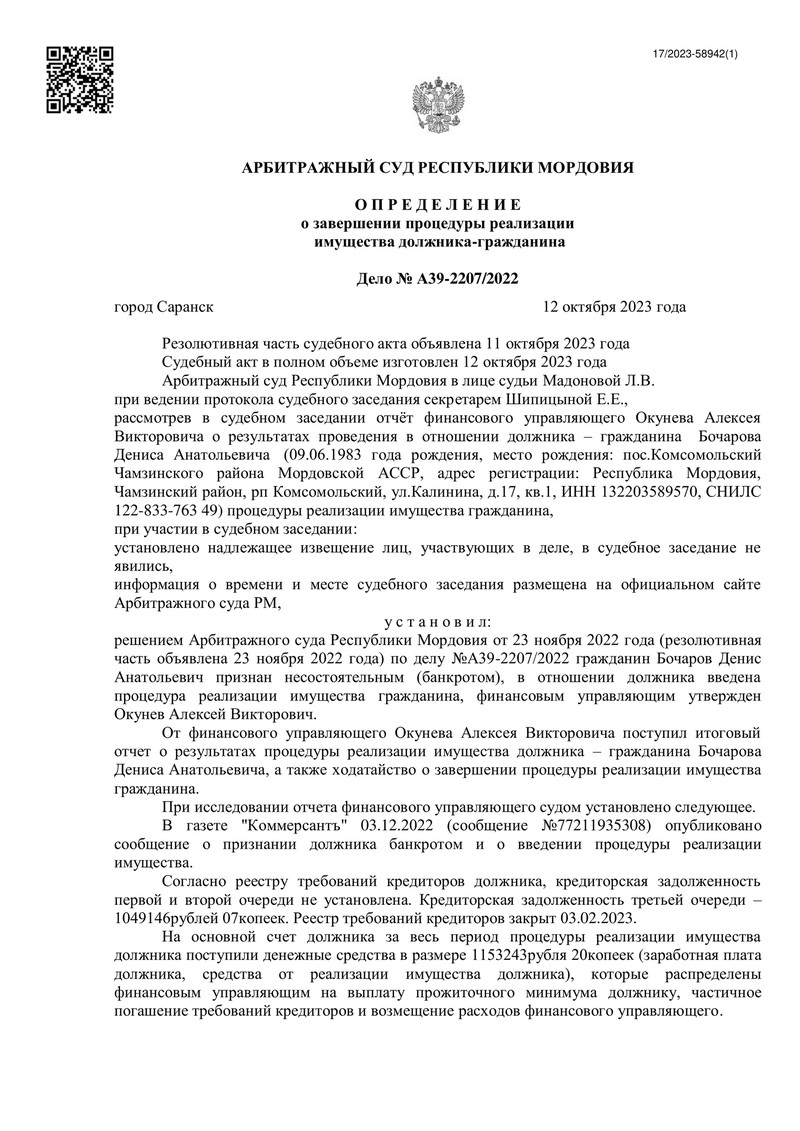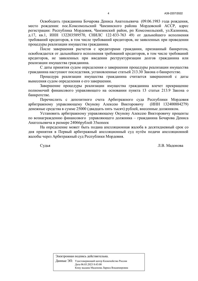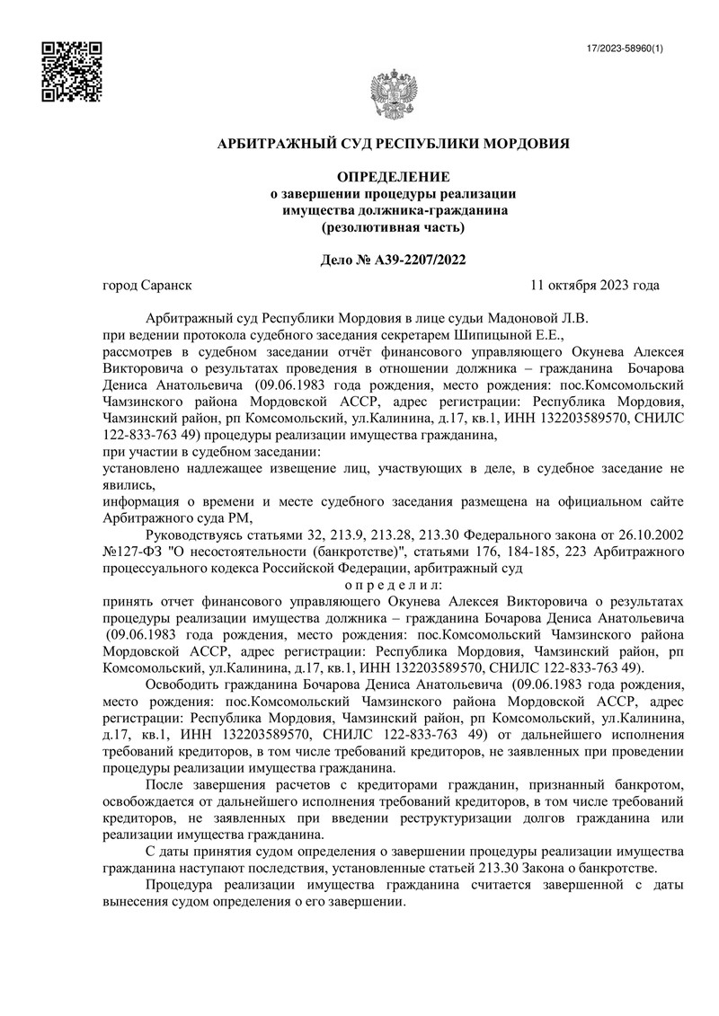11 октября 2023 года Арбитражный суд Республики Мордовия огласил решение по делу №А39-2207/2022. Рассмотрев отчёт финансового управляющего о результатах процедуры реализации имущества, суд постановил освободить нашего клиента от дальнейшего исполнения требований кредиторов. Это стало возможным благодаря грамотной и профессиональной работе команды "ДОЛГАМ.НЕТ", которая сумела довести дело до успешного завершения.