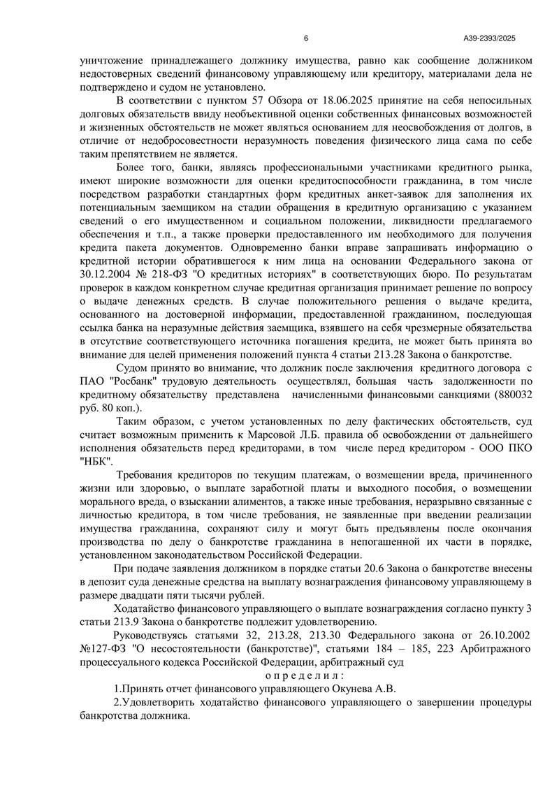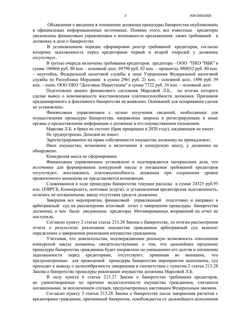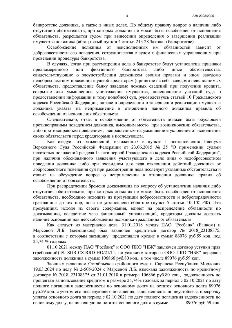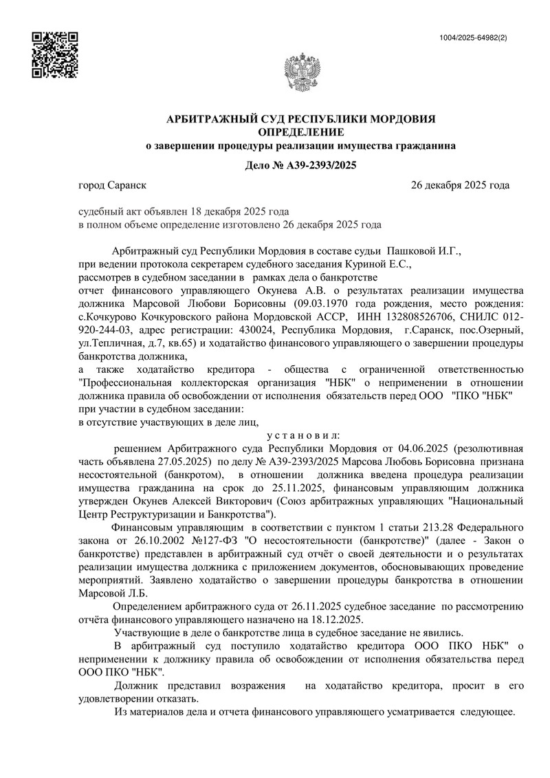 Арбитражный суд Республики Мордовия завершил процедуру реализацию имущества и применил правило об освобождении гражданина от дальнейшего исполнения требований кредиторов в рамках дела №А39-2393/2025. Резолютивная часть определения вынесена 18 декабря 2025 года.