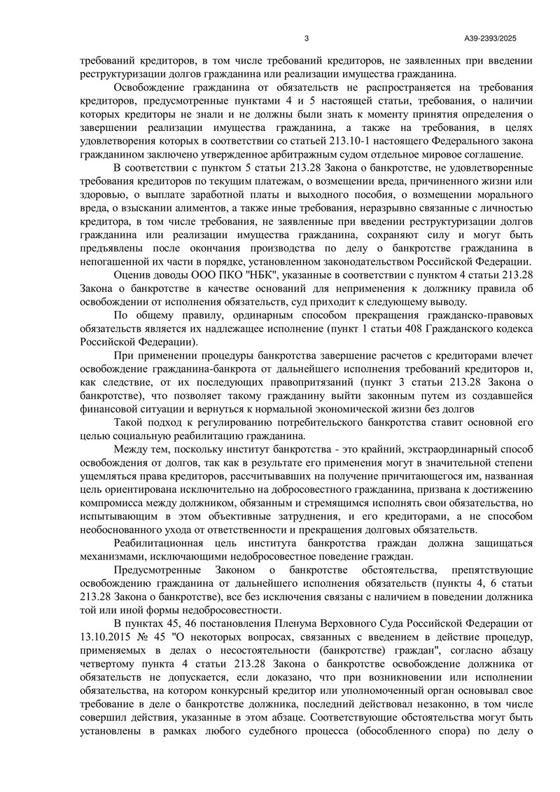 При этом суд напомнил и стандартные правовые ограничения: освобождение не распространяется на требования, перечисленные в пунктах 4 – 6 статьи 213.28 Закона о банкротстве: например, отдельные категории личных обязательств, а также на требования, о наличии которых кредиторы не знали и не должны были знать к моменту завершения процедуры.