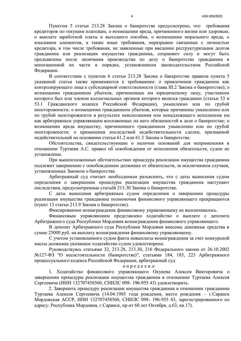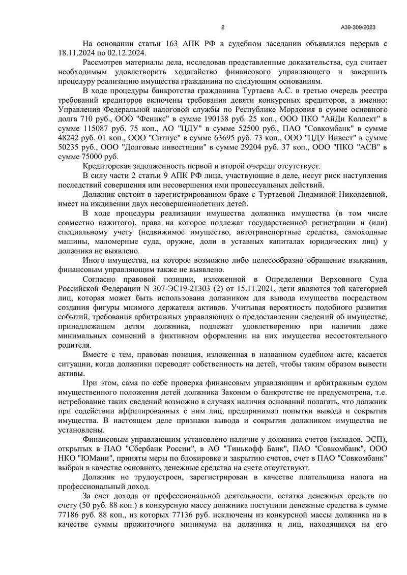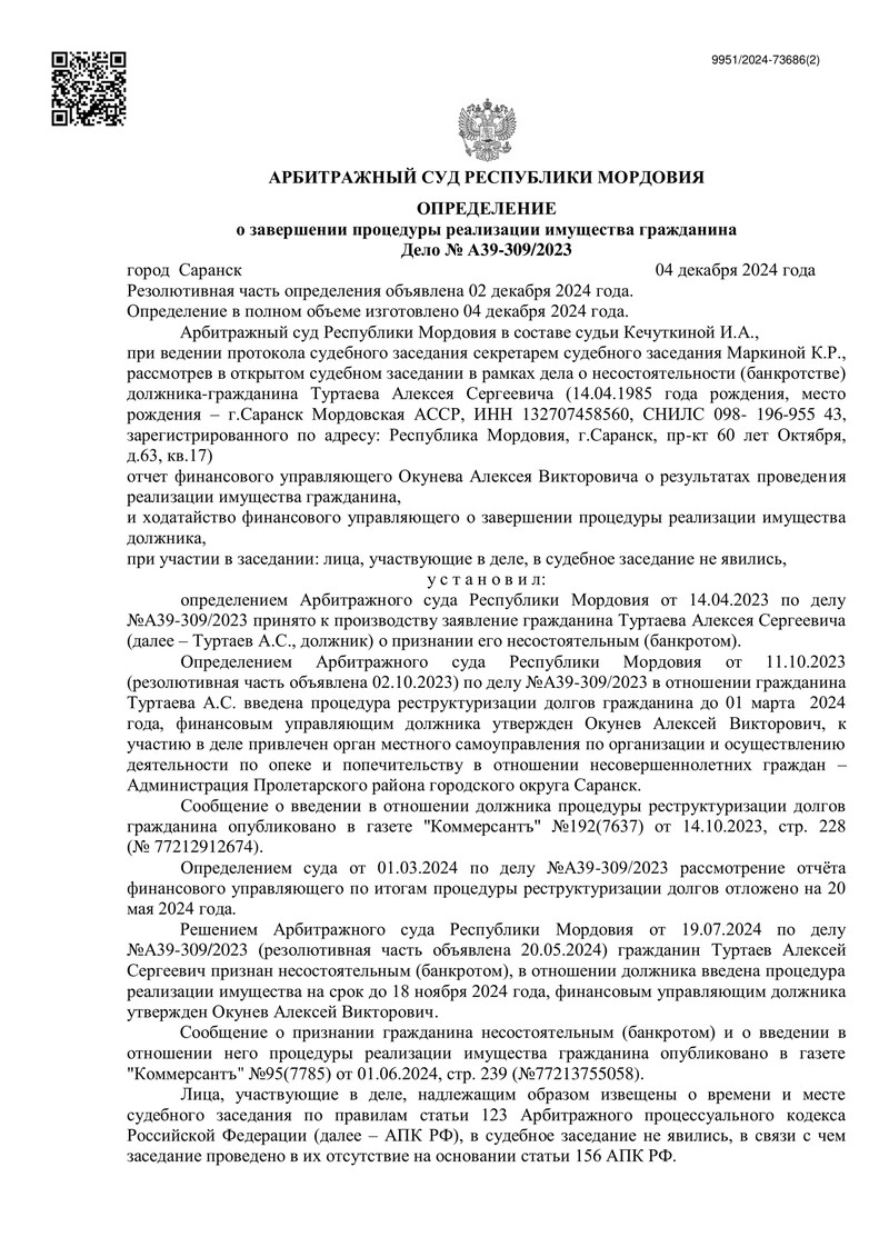 2 декабря 2024 года Арбитражный суд Республики Мордовия вынес определение о завершении процедуры реализации имущества гражданина. Итогом судебного процесса стало полное освобождение нашего клиента от всех обязательств перед кредиторами, в том числе перед теми, кто не заявлял свои требования в установленный срок.