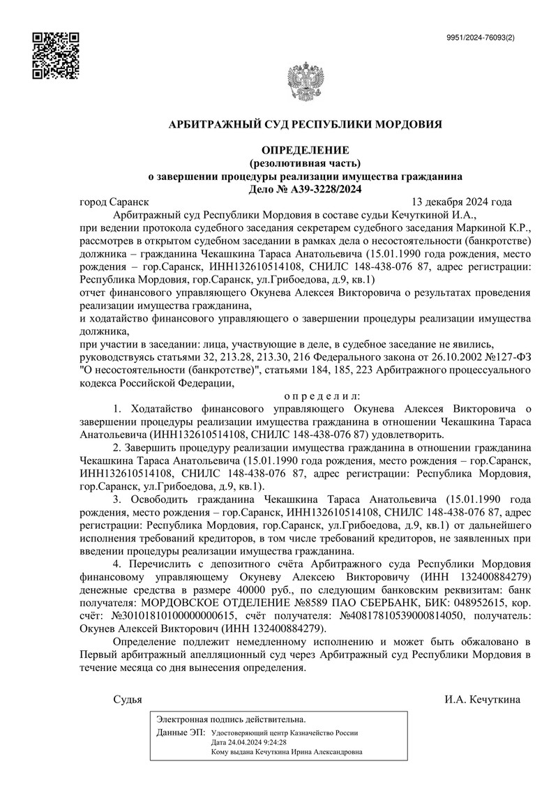 Судебный процесс завершился 16 декабря 2024 года, когда Арбитражный суд Республики Мордовия вынес определение о завершении процедуры реализации имущества. Судебное определение освободило нашего клиента от дальнейшего исполнения обязательств перед кредиторами, включая те, кто не заявил свои требования в рамках процесса.