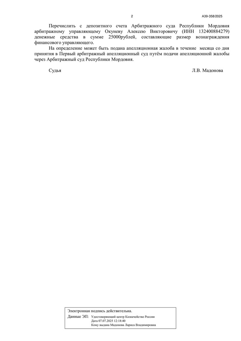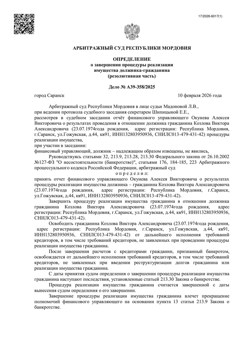 Дело № А39-358/2025 (Республика Мордовия): процедура банкротства завершена, долги списаны