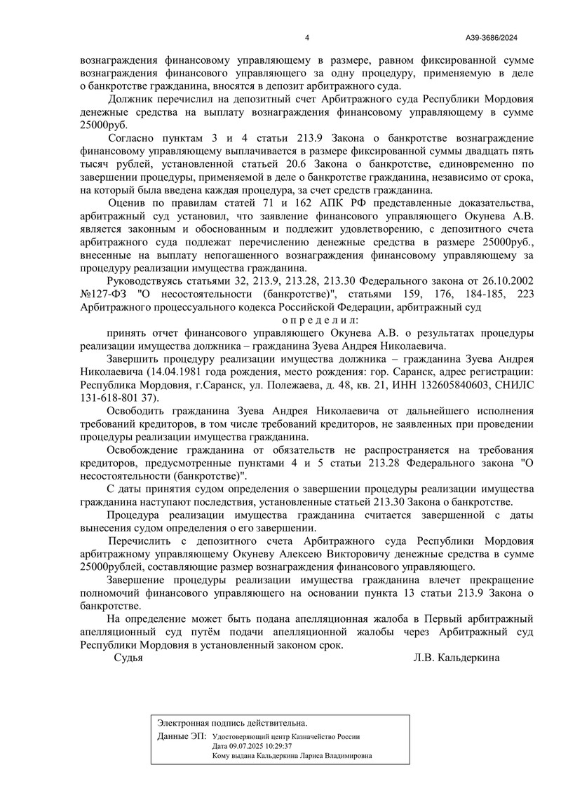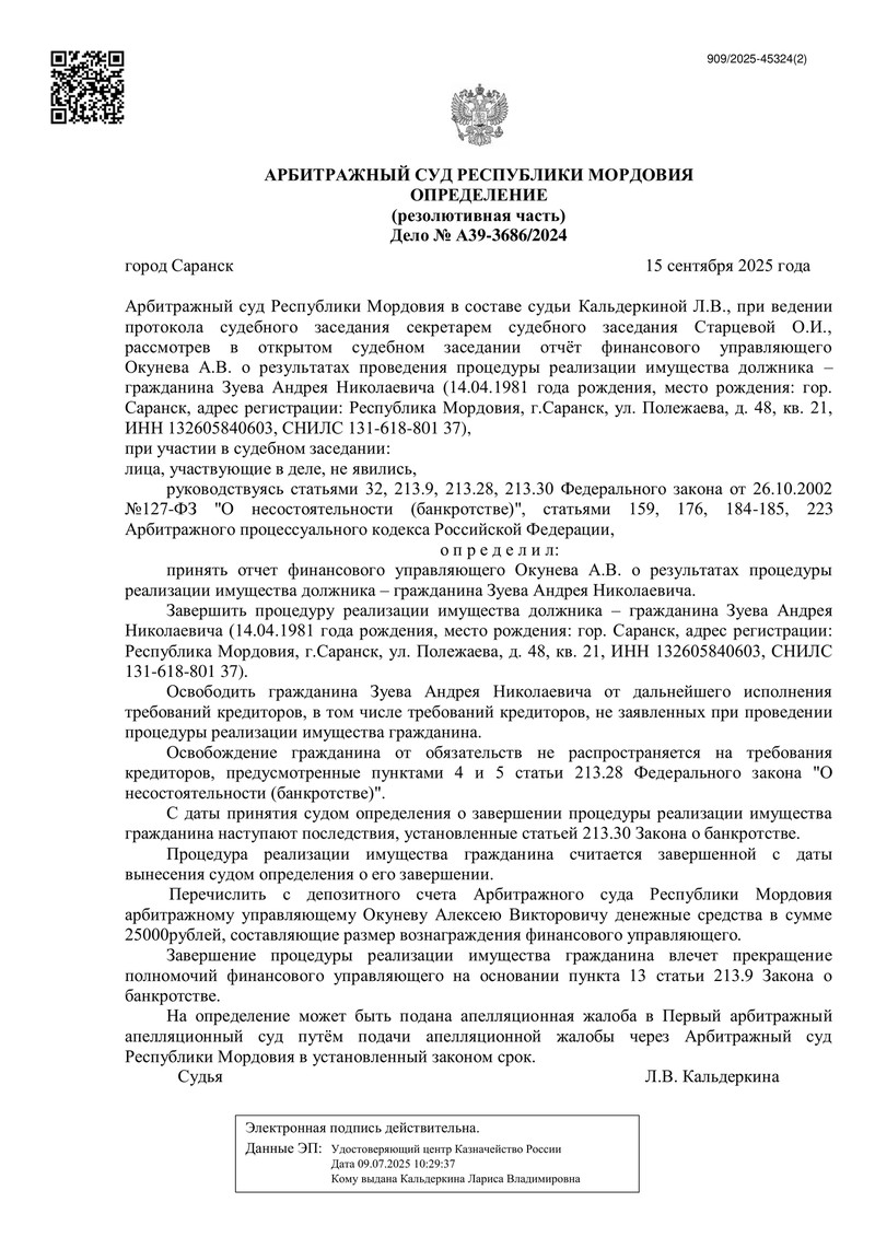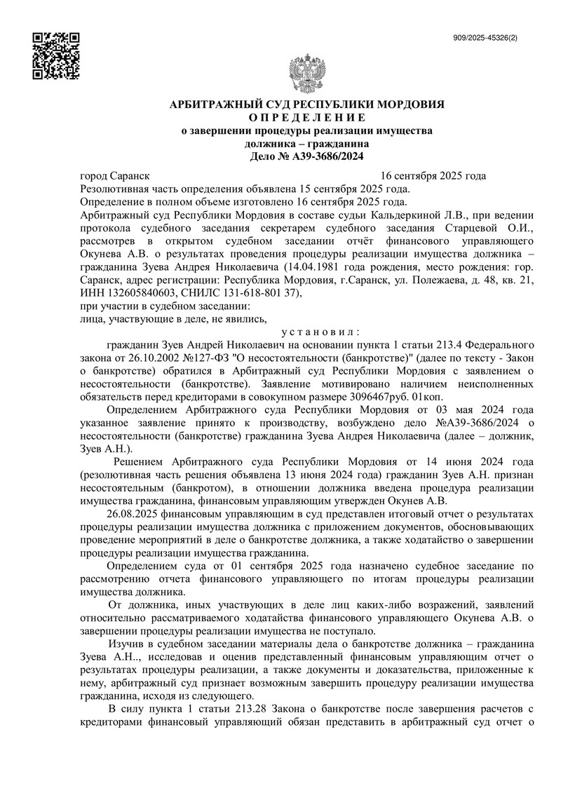 Арбитражный суд Республики Мордовия рассмотрел дело о банкротстве №А39-3686/2024. Благодаря профессионализму команды "ДОЛГАМ.НЕТ" наш клиент был полностью освобождён от долгового бремени!