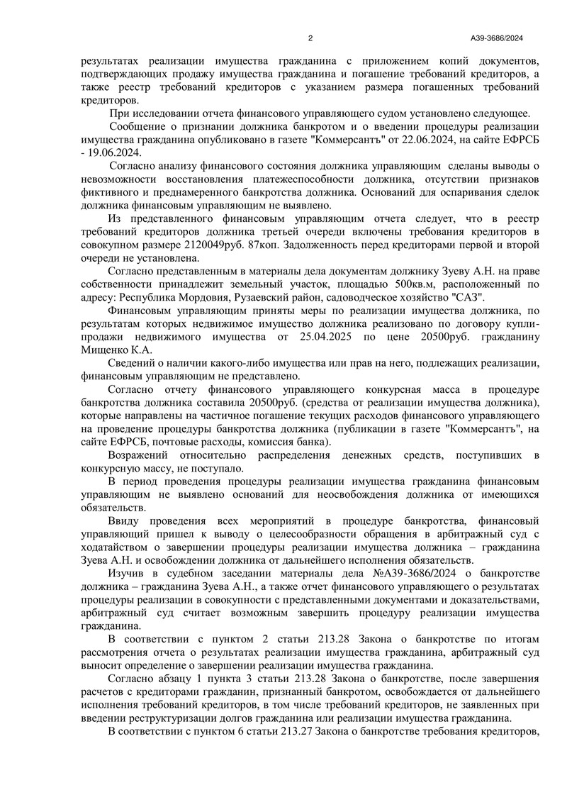 - Процедура реализации имущества была завершена, а полномочия финансового управляющего - прекращены.