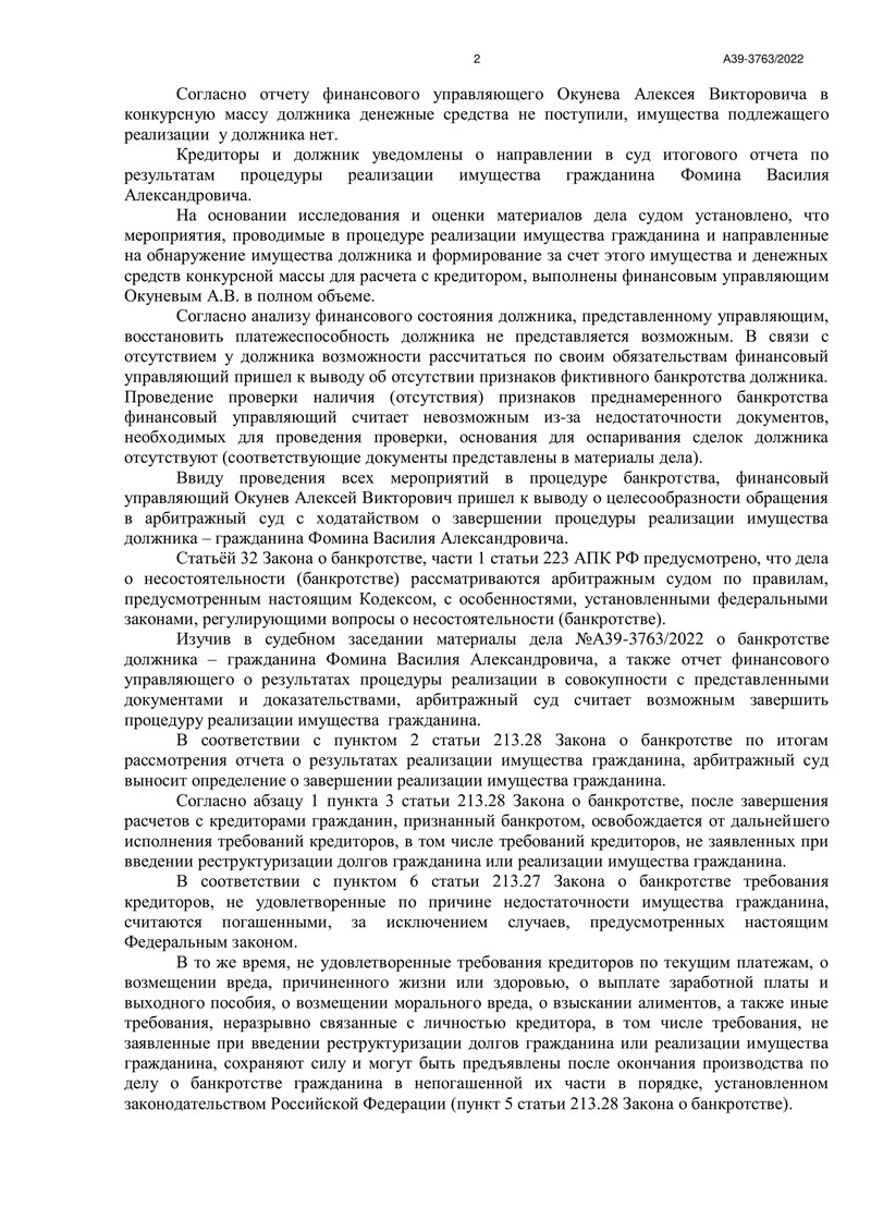 - принять отчет финансового управляющего о результатах проведения процедуры реализации имущества гражданина;