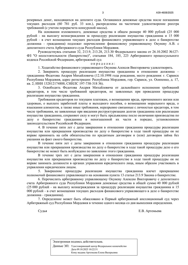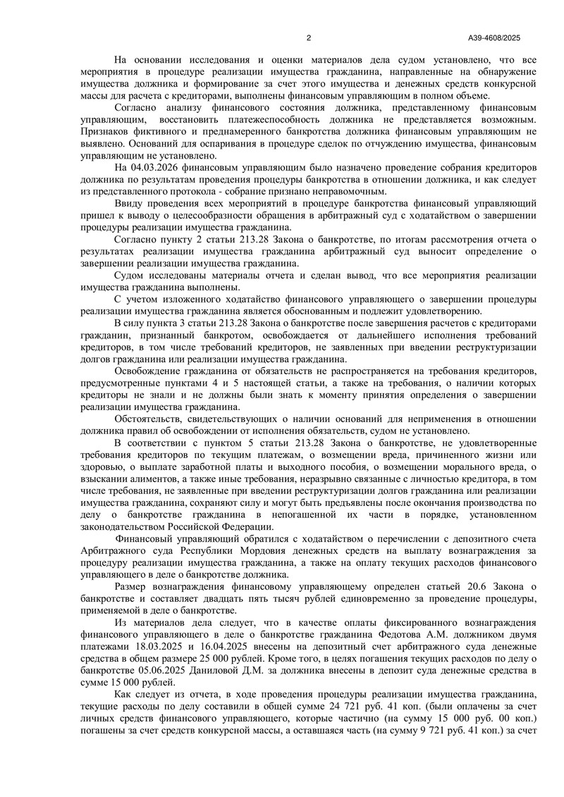 17 марта 2026 года Арбитражный суд Республики Мордовия завершил процедуру реализации имущества по делу №А39-4608/2025.