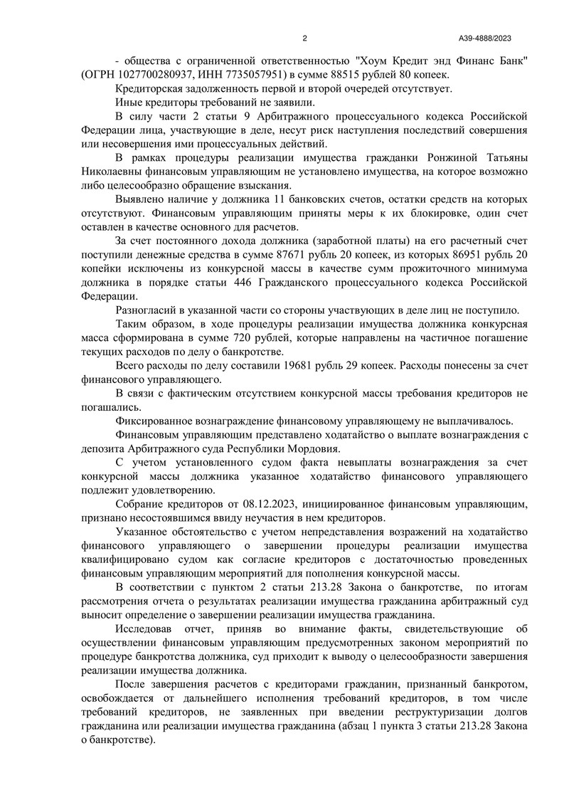 Очередное дело завершено успешно благодаря компании "ДОЛГАМ.НЕТ"! В рамках дела №А39-4888/2023, рассмотренного Арбитражным судом Республики Мордовия в городе Саранске, была завершена процедура реализации имущества должника.
