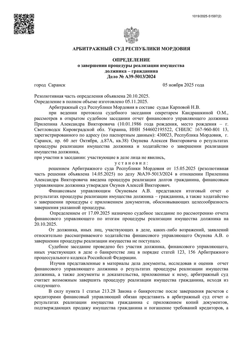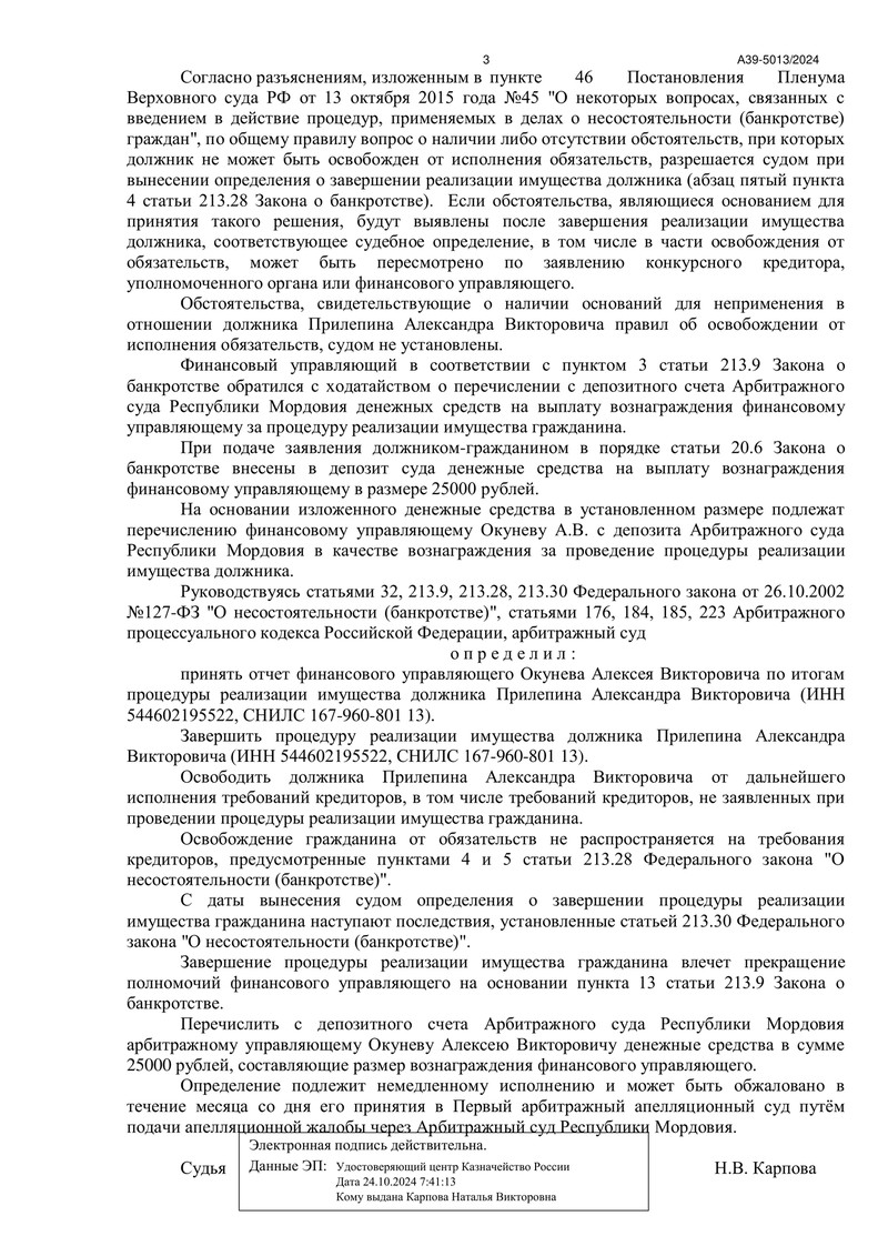 Команда "ДОЛГАМ.НЕТ" с радостью сообщает о новой процедуре банкротства гражданина — теперь уже бывшего должника. Дело № А39-5013/2024 завершилось определением об освобождении от дальнейшего исполнения обязательств перед кредиторами, заявленных и незаявленных в процедуре реализации имущества.