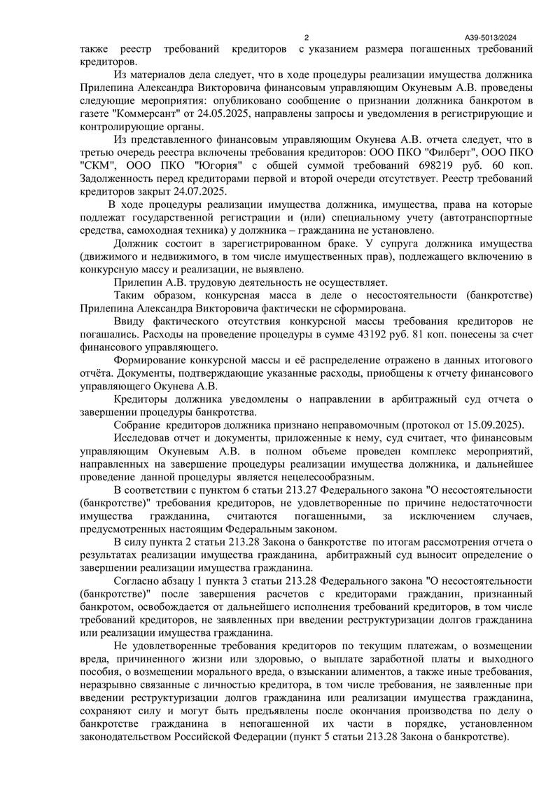 Суд внимательно изучил отчёт финансового управляющего, учел отсутствие возражений со стороны кредиторов и завершил процедуру реализации имущества.