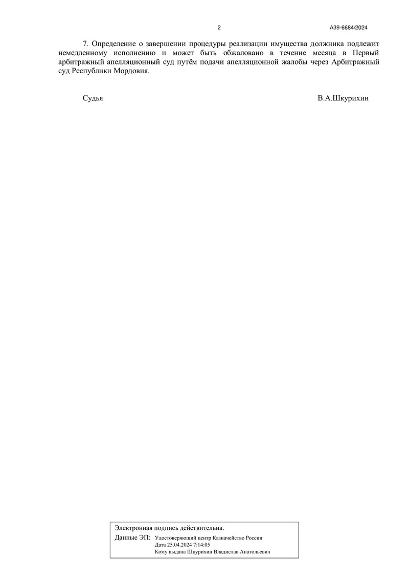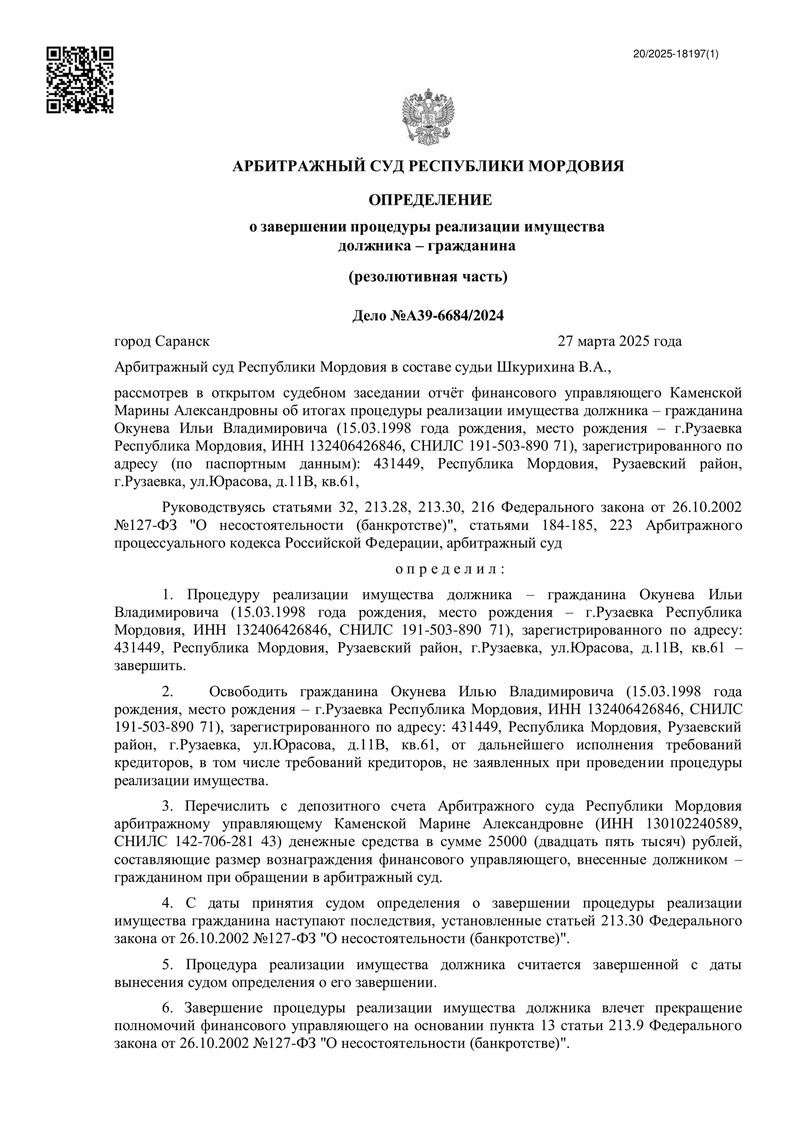 27 марта 2025 года Арбитражный суд Республики Мордовия вынес определение о завершении процедуры реализации имущества гражданина в рамках дела №А39-6684/2024 и освободил клиента компании "ДОЛГАМ.НЕТ" от всех долговых обязательств, в том числе от требований кредиторов, которые не были заявлены в рамках банкротства.