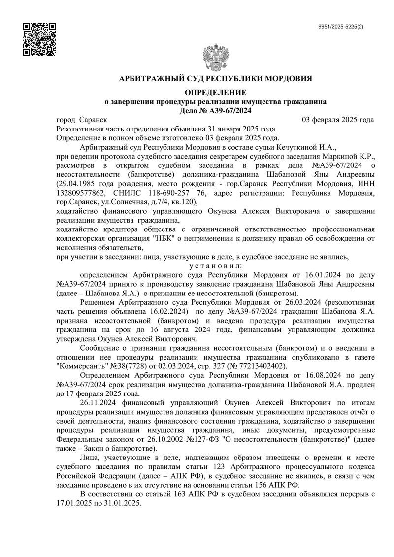 Арбитражный суд Республики Мордовия вынес определение о завершении процедуры банкротства нашего клиента и полном списании его долгов. Это новая победа на счету "ДОЛГАМ.НЕТ"!