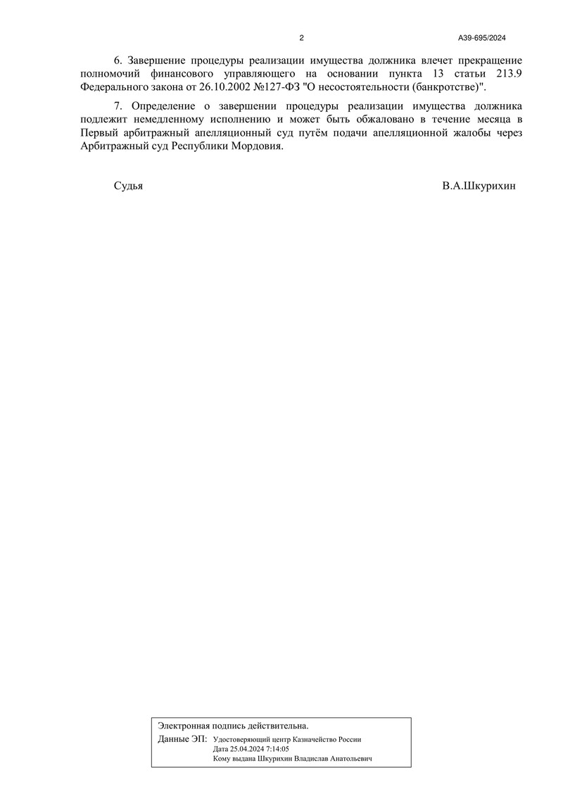 В процессе рассмотрения дела судья Арбитражного суда Республики Мордовия вынес решение о завершении процедуры реализации имущества должника. Это важный момент в деле, так как именно процедура реализации имущества является одной из ключевых стадий банкротства, после которого и принимается решение о дальнейшем освобождении от финансовых обязательств.
