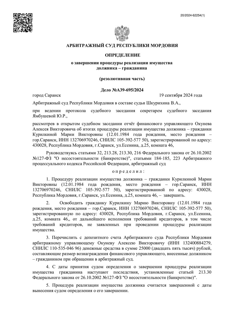 Дело №А39-695/2024 стало еще одним подтверждением эффективности команды "ДОЛГАМ.НЕТ", которая помогает своим клиентам не только юридически, но и морально. Процедура завершена, клиент освобожден от долгов, а компания продолжает помогать и дргуим должникам достигать подобного результата.