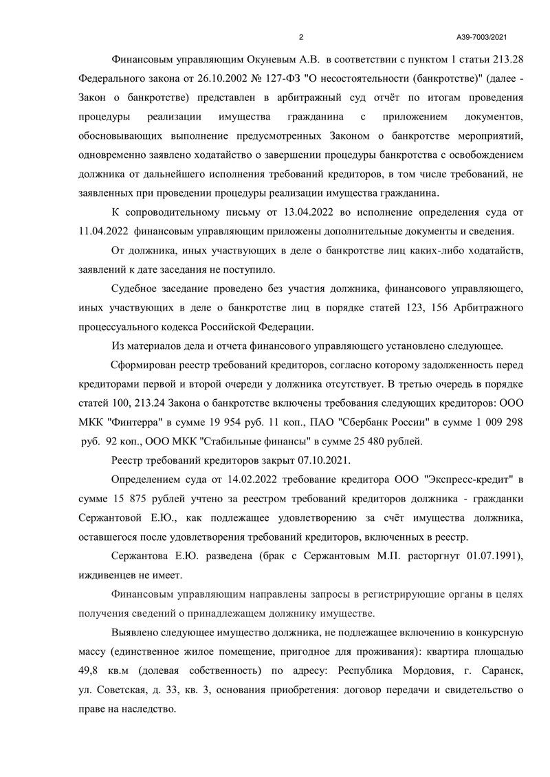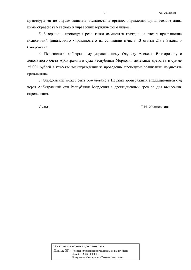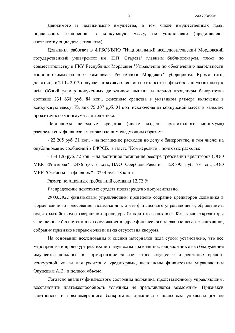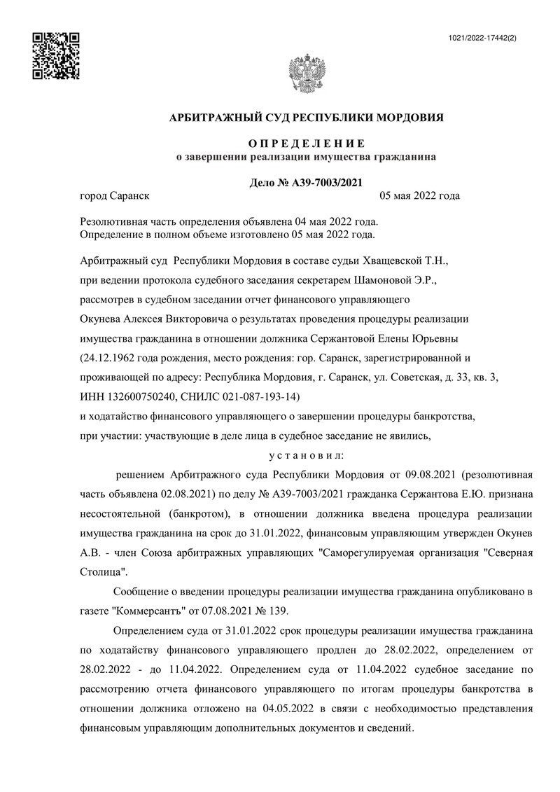 Еще одна победа на счету компании "ДОЛГАМ.НЕТ"! На этот раз в Арбитражном суде Республики Мордовия успешно завершено дело №А39-7003/2021 о банкротстве физического лица.