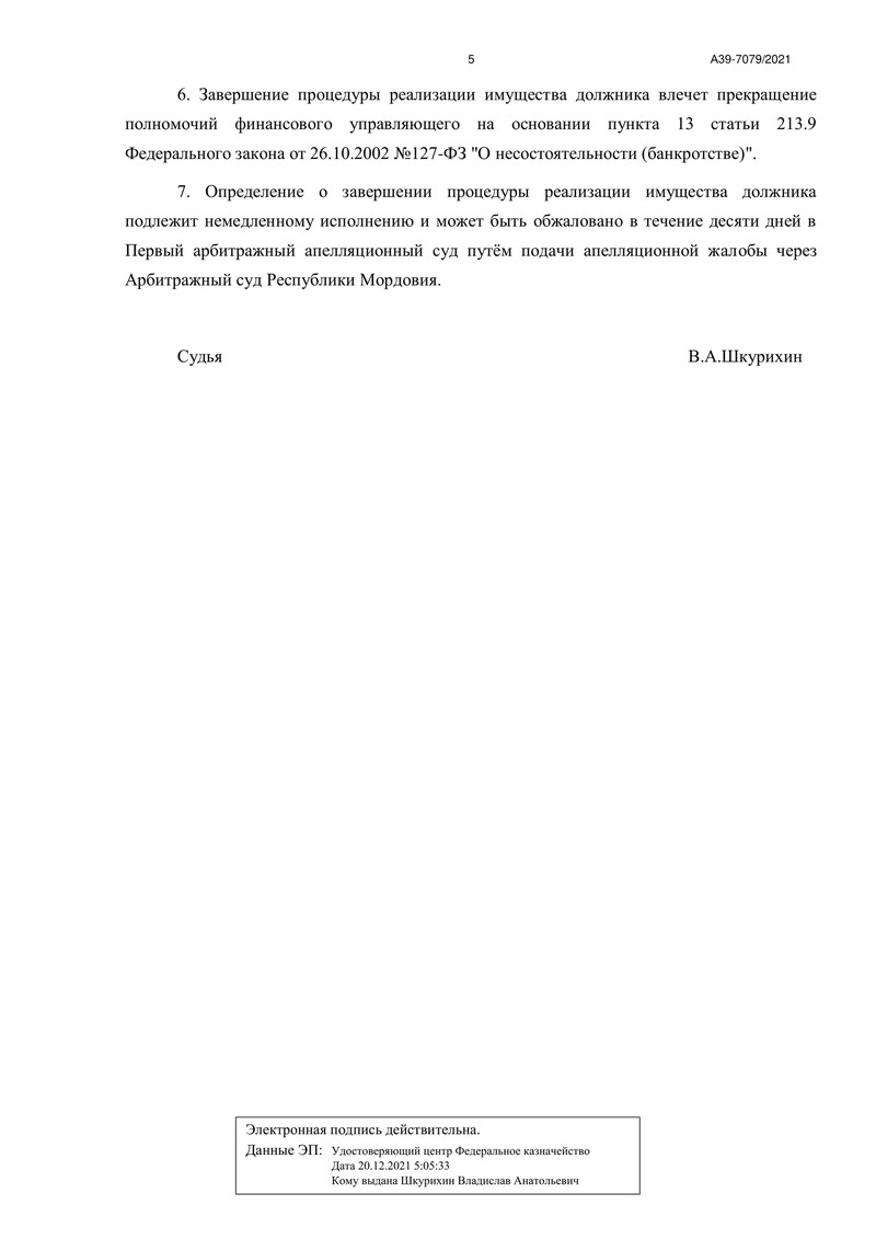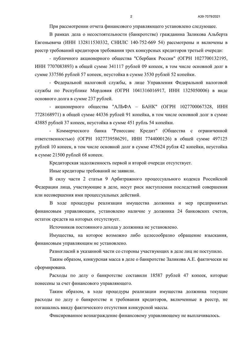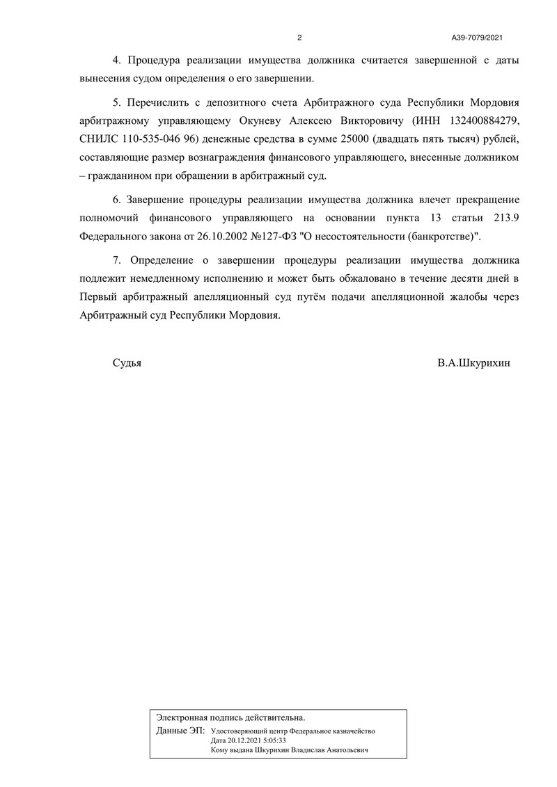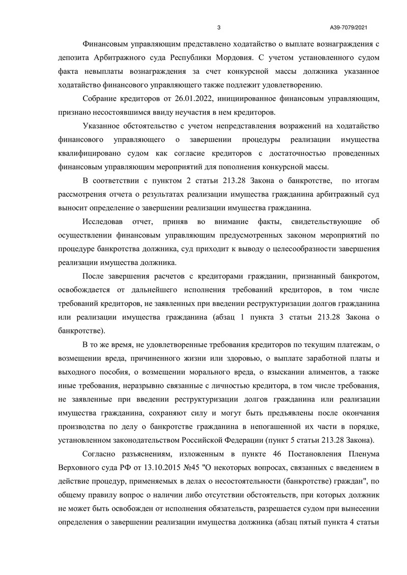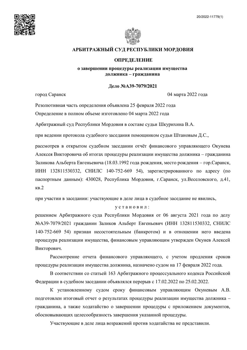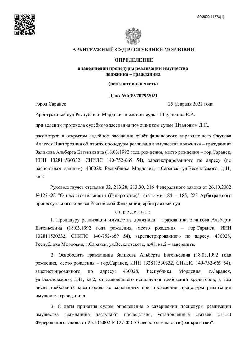 Еще один клиент компании "ДОЛГАМ.НЕТ" успешно прошел процедуру банкротства благодаря помощи нашей высококвалифицированной команды. Дело под номером А39-7079/2021 было рассмотрено Арбитражным судом Республики Мордовия, и 25 февраля 2022 года судья вынес определение о завершении процедуры реализации имущества должника и освобождении его от дальнейших обязательств перед кредиторами.