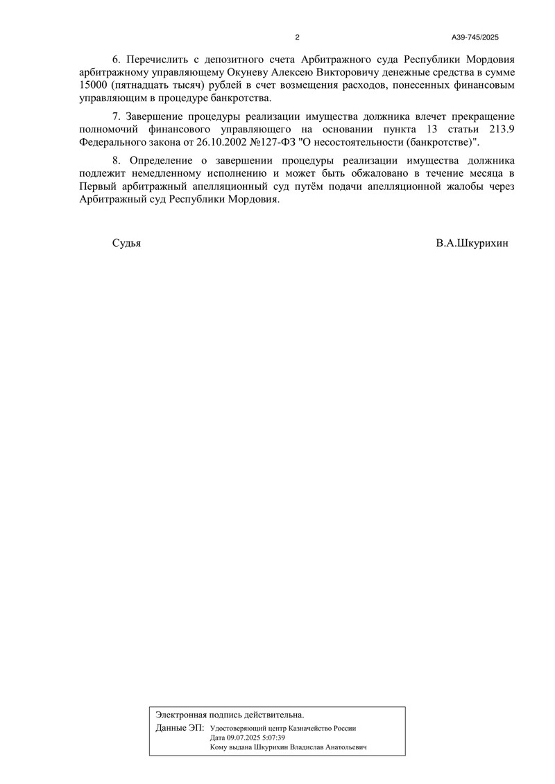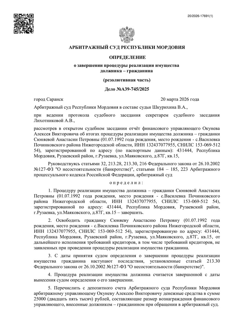 Суд также урегулировал финансовые вопросы процедуры. С депозитного счёта суда финансовому управляющему было перечислено 25 000 рублей вознаграждения и 15 000 рублей в счёт возмещения понесённых расходов. После завершения реализации имущества полномочия финансового управляющего прекращаются в соответствии с п. 13 ст. 213.9 Закона о банкротстве.