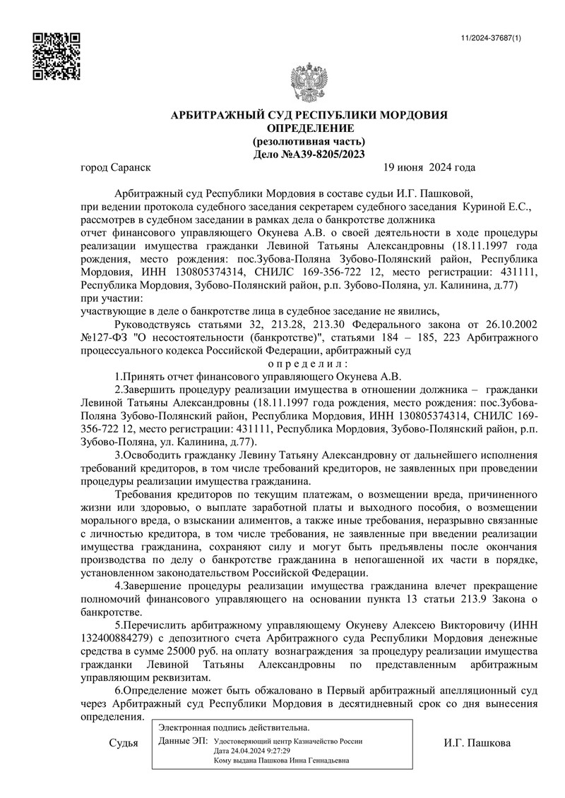 Очередное дело о банкротстве завершено успешно благодаря команде "ДОЛГАМ.НЕТ". Арбитражный суд Республики Мордовия 19 июня 2024 года вынес определение по делу №А39-8205/2023.