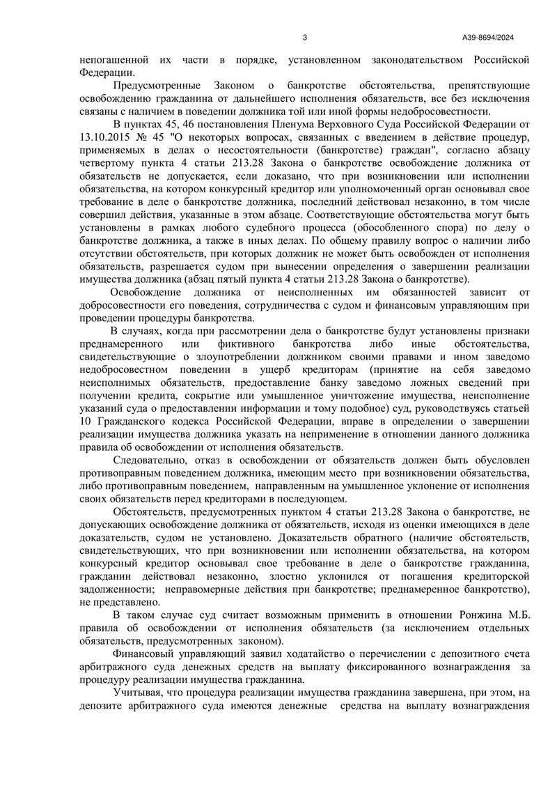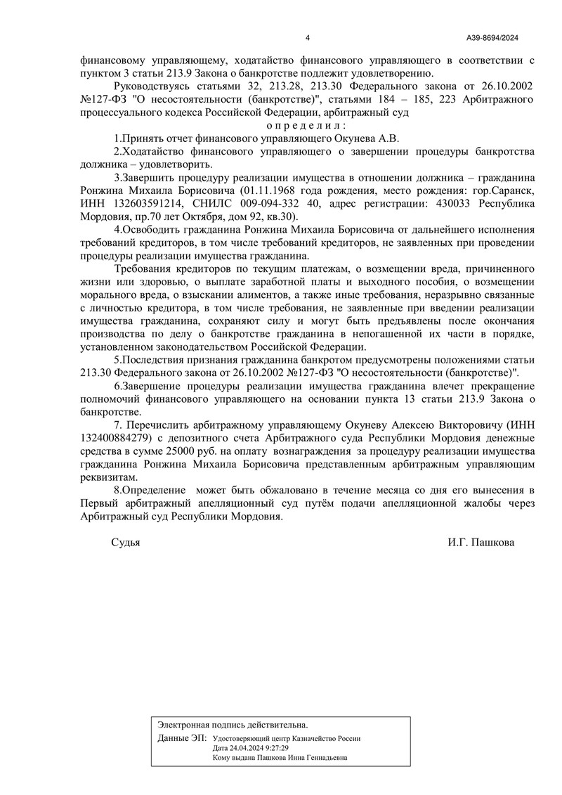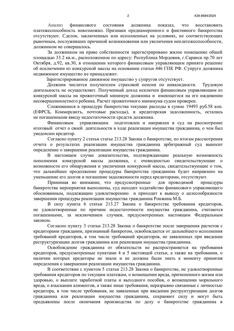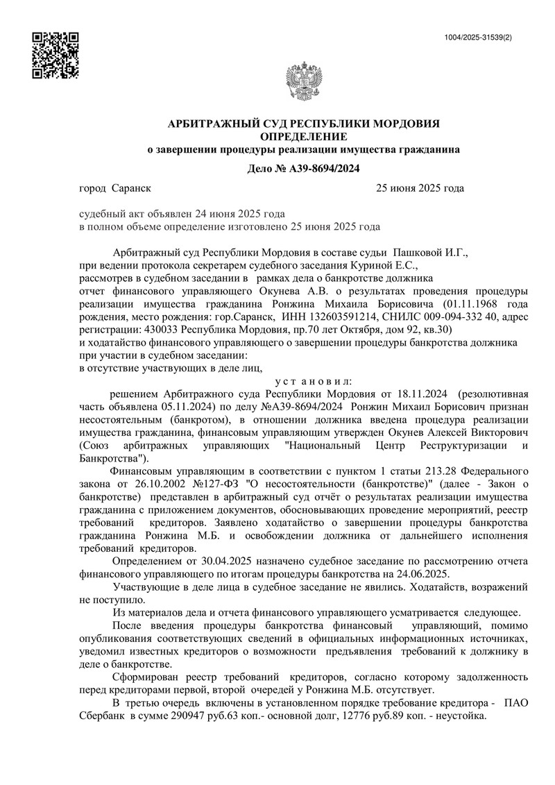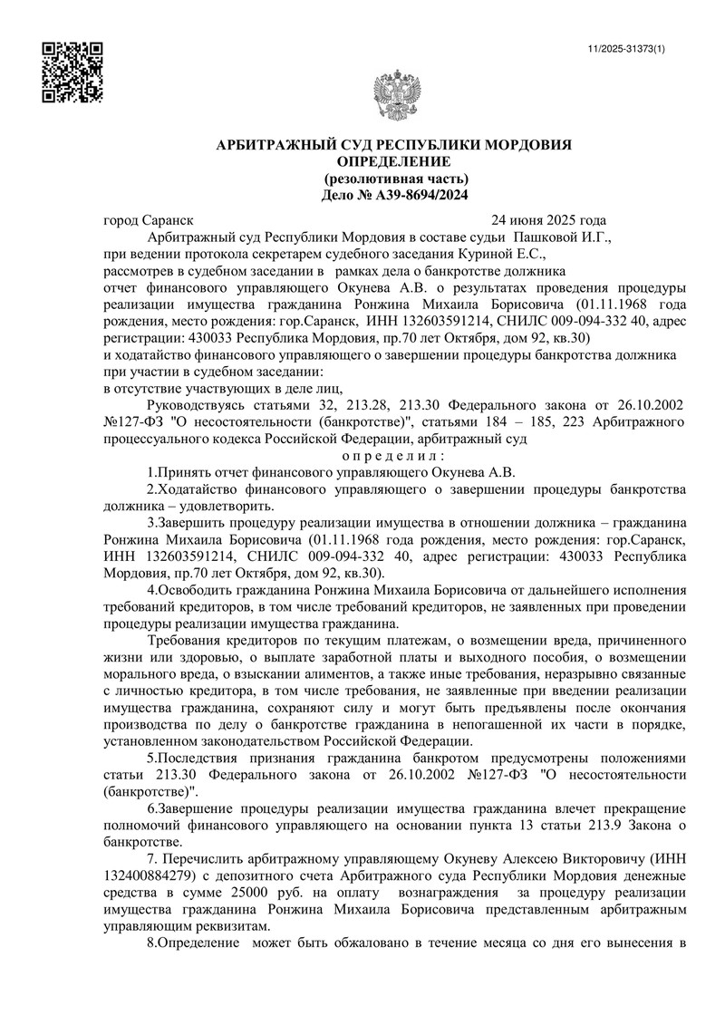 Компания "ДОЛГАМ.НЕТ" успешно завершила дело №А39-8694/2024 о банкротстве. Определением Арбитражного суда Республики Мордовия от 24 июня 2025 года была завершена процедура реализации имущества, а наш клиент был освобожден от долговых обязательств перед кредиторами.