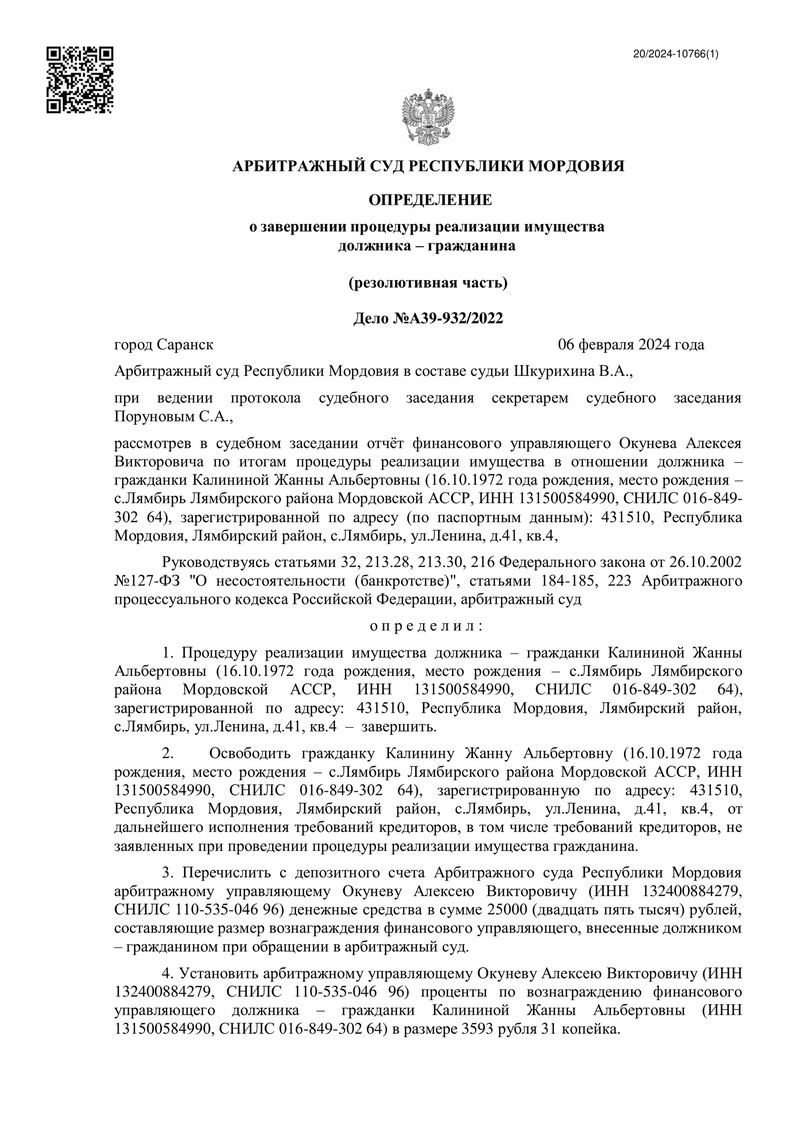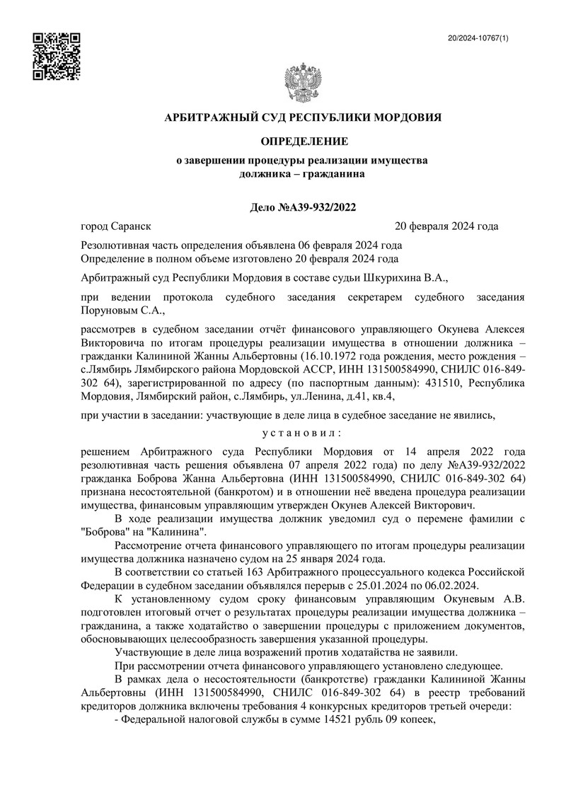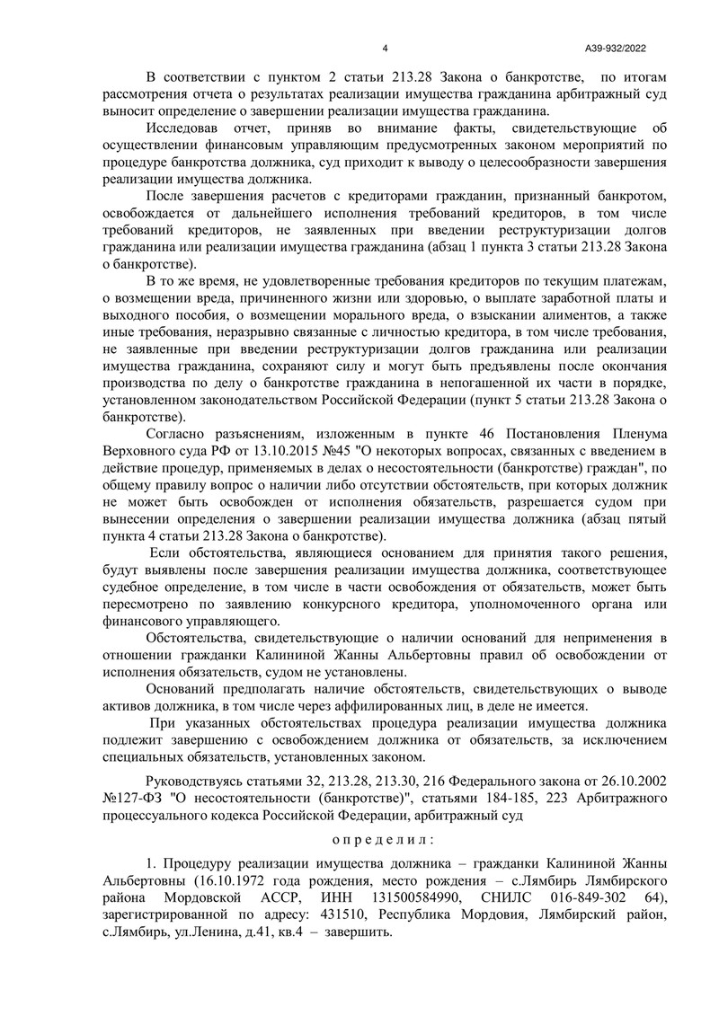 Мы снова рады поделиться успешным опытом нашего клиента! На этот раз Арбитражный суд Республики Мордовия вынес положительное решение по делу №А39-932/2022, завершив процедуру реализации имущества нашего клиента.