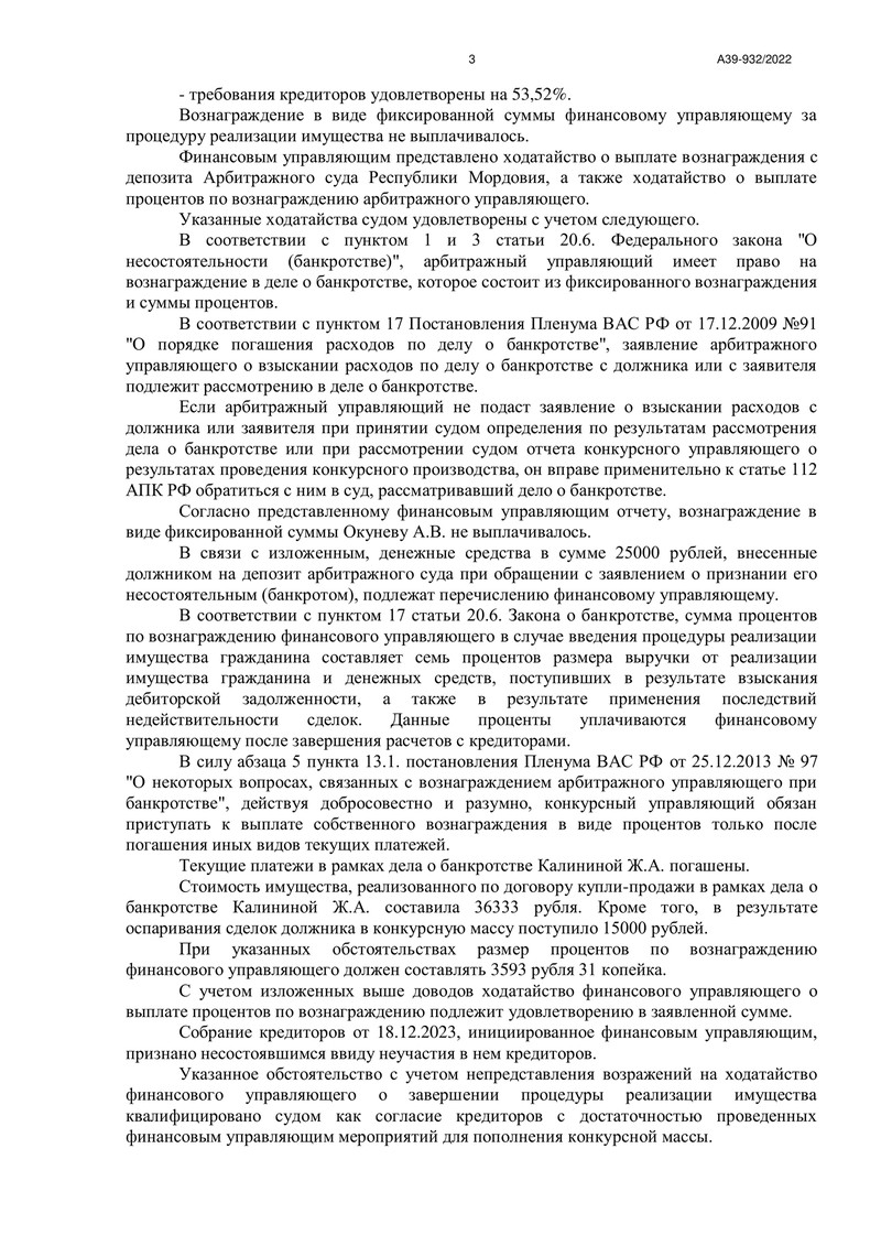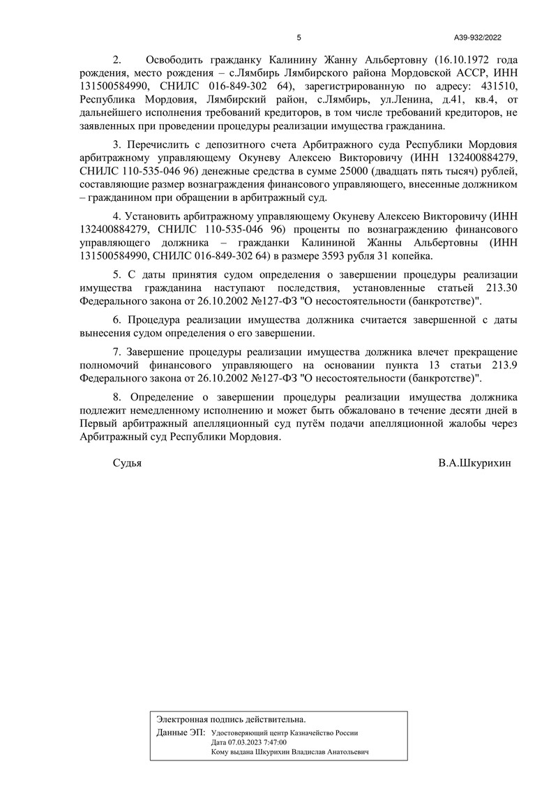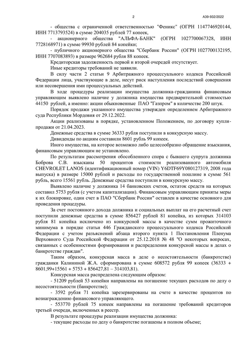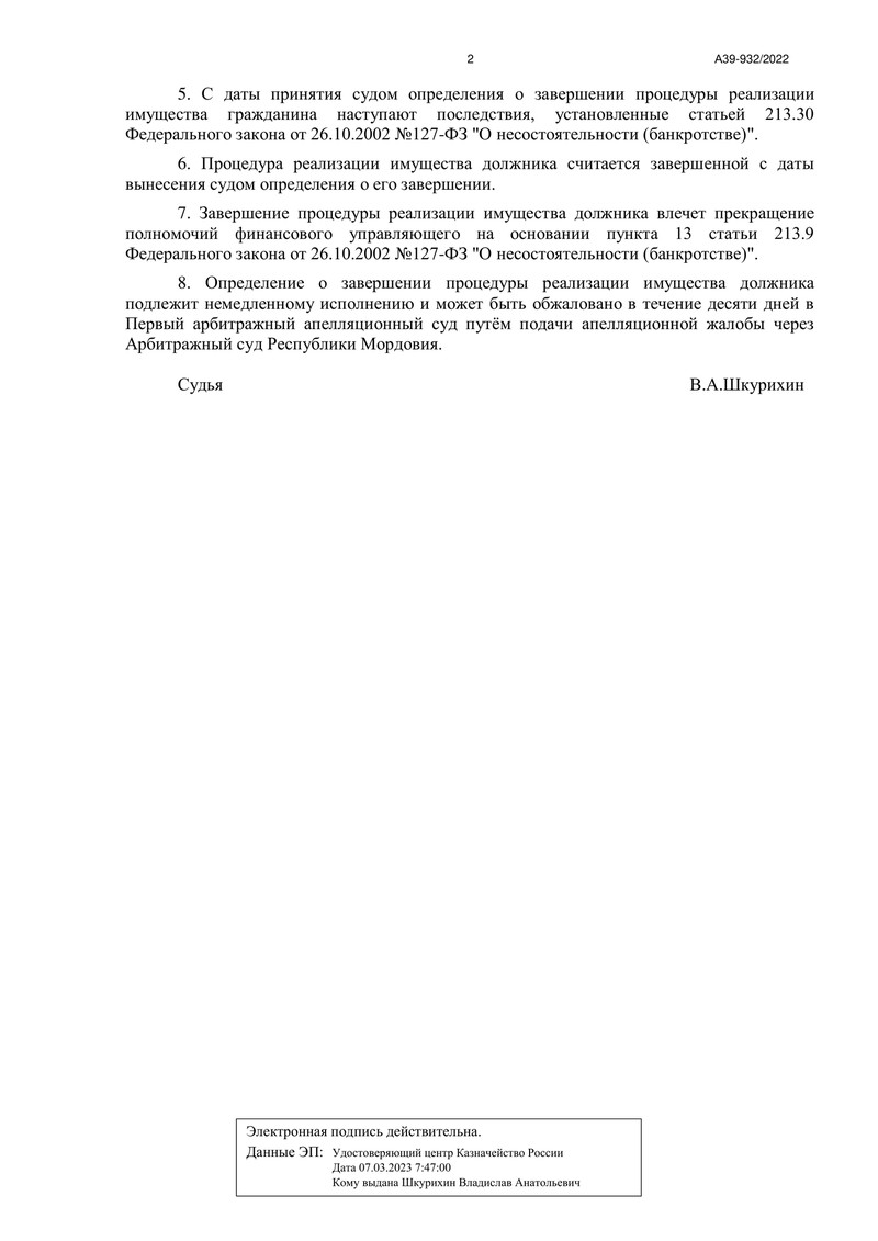 Мы снова рады поделиться успешным опытом нашего клиента! На этот раз Арбитражный суд Республики Мордовия вынес положительное решение по делу №А39-932/2022, завершив процедуру реализации имущества нашего клиента.