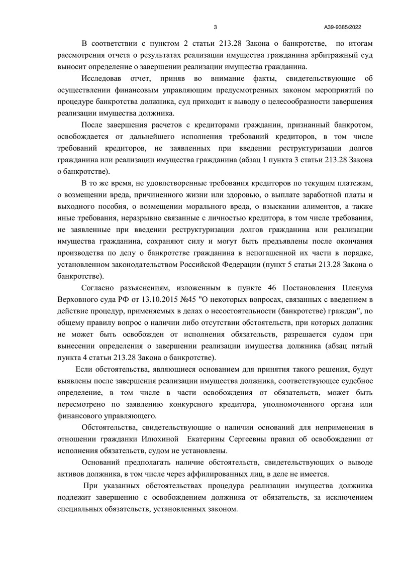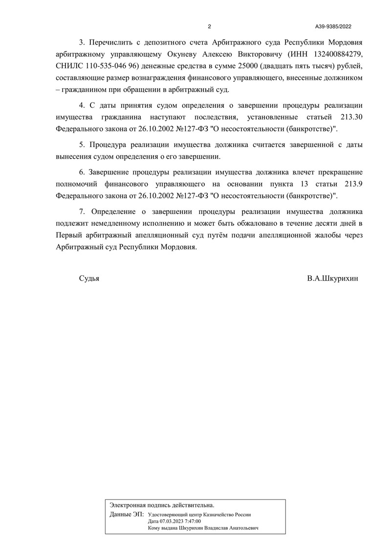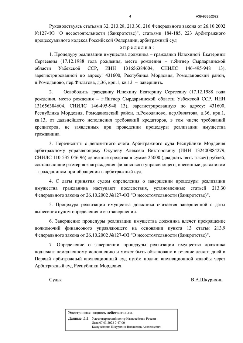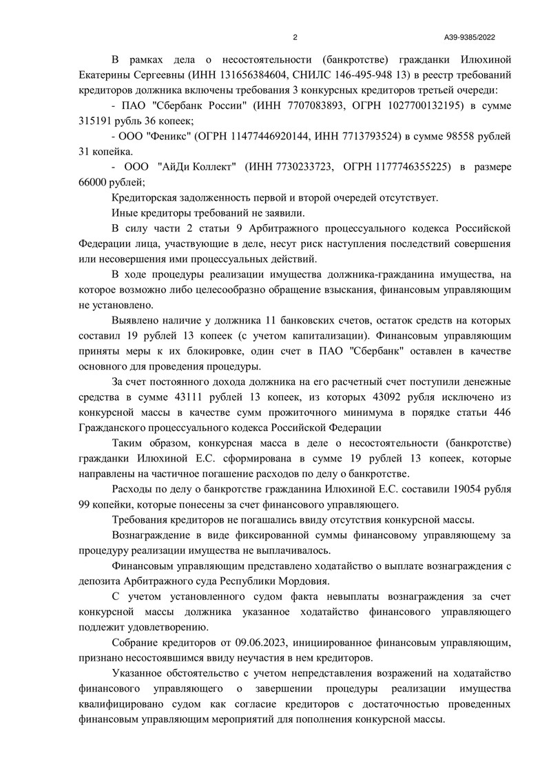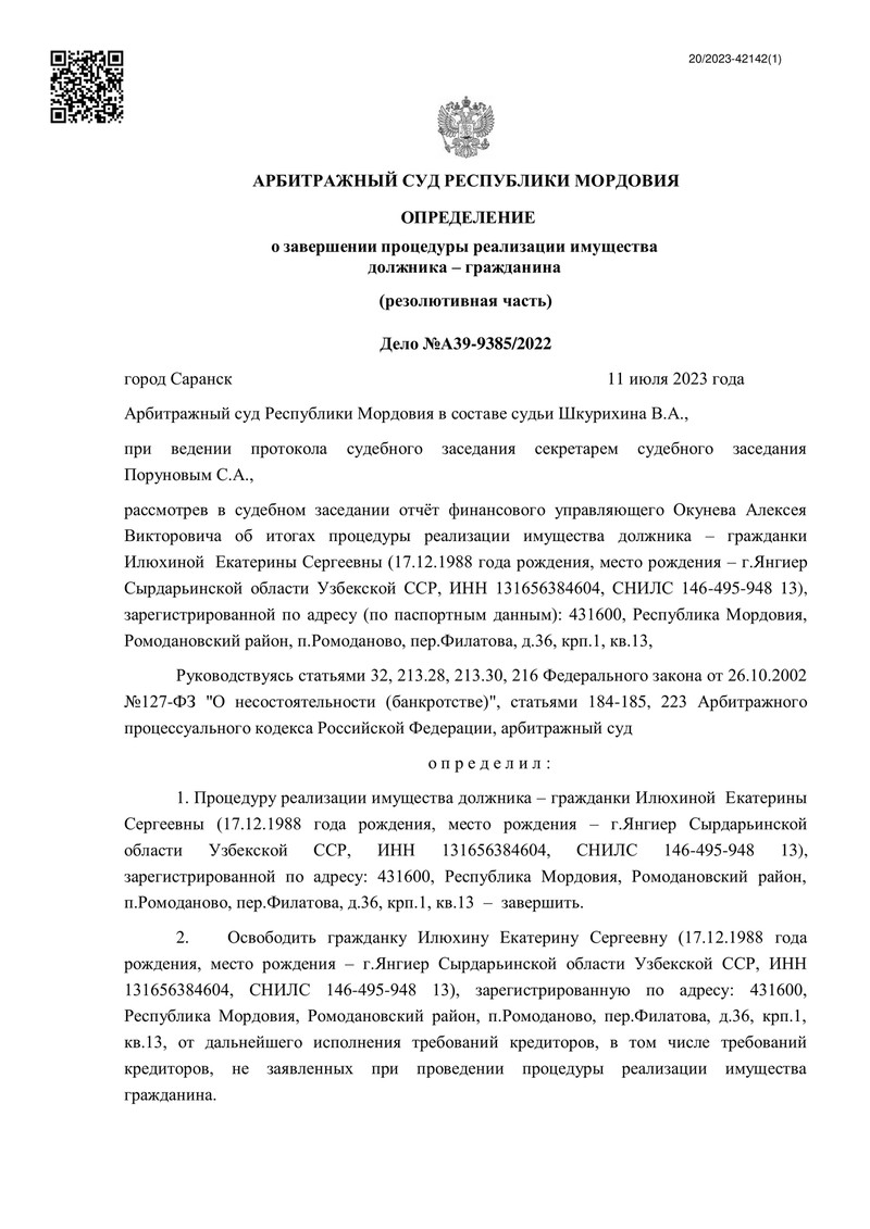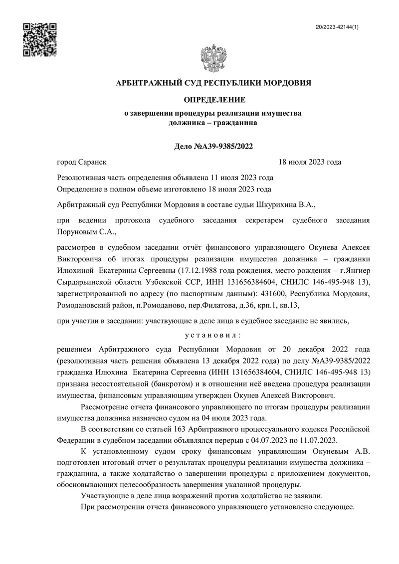 10 июля 2023 года Арбитражный суд Республики Мордовия суд вынес определение о завершении процедуры реализации имущества нашего клиента в рамках дела №А39-9385/2022, начатого еще в 2022 году. "ДОЛГАМ.НЕТ" сопровождала его на каждом этапе, предоставляя квалифицированную юридическую поддержку и консультации. В процессе банкротства участвовал финансовый управляющий, который предоставил отчет об итогах процедуры реализации имущества.