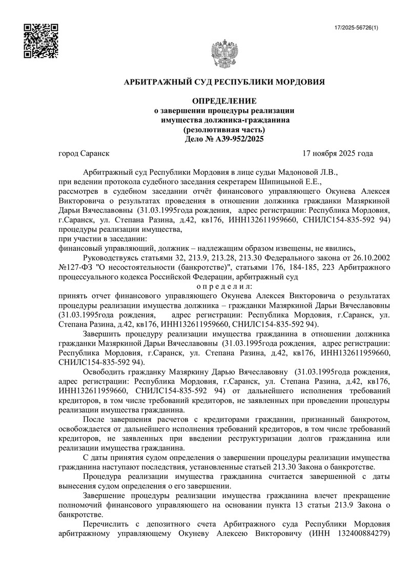 17 ноября 2025 года Арбитражный суд Республики Мордовия в лице судьи Л.В. Мадоновой утвердил отчет финансового управляющего и принял итоговое определение: