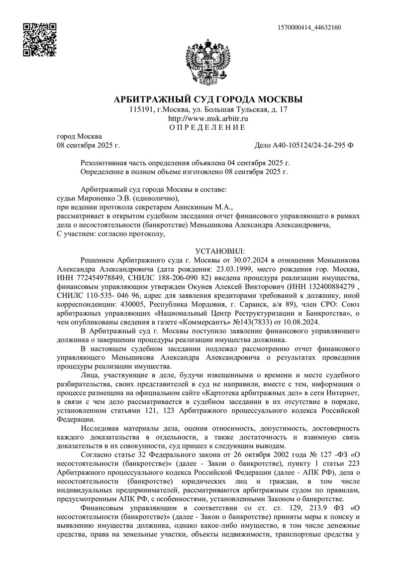 В сентябре 2025 года Арбитражный суд города Москвы вынес определение, которым завершил процедуру банкротства нашего клиента. Такого результата удалось добиться благодаря слаженной работе специалистов компании "ДОЛГАМ.НЕТ", выступившей гарантом качества и надежности оказанных юридических услуг. Это еще раз подтверждает высокий профессионализм и опыт наших экспертов в делах о несостоятельности граждан.