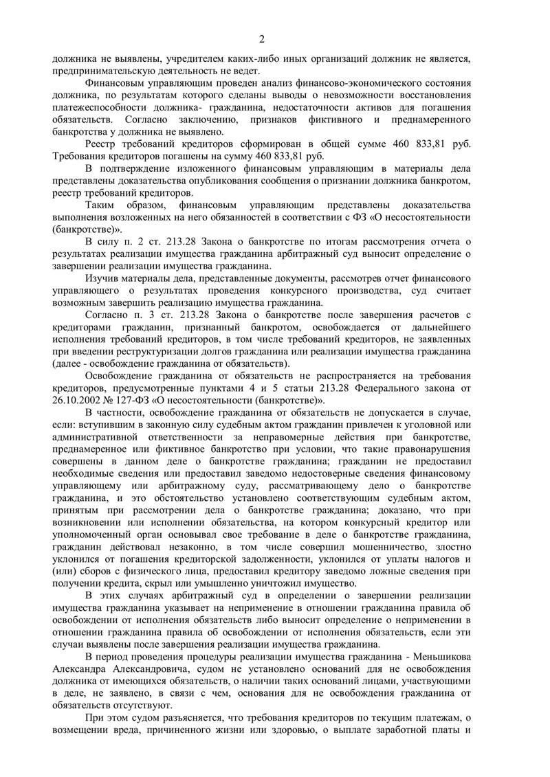 На основании п. 3 ст. 213.28 Закона о банкротстве суд освободил нашего клиента от дальнейшего исполнения не только всех текущих обязательств перед включёнными в реестр кредиторами, но и от требований, которые не были заявлены на момент введения реструктуризации долгов или реализации имущества. Это означает, что теперь гражданин окончательно избавлен от долгового бремени и может начать новую финансовую жизнь без давления со стороны кредиторов.