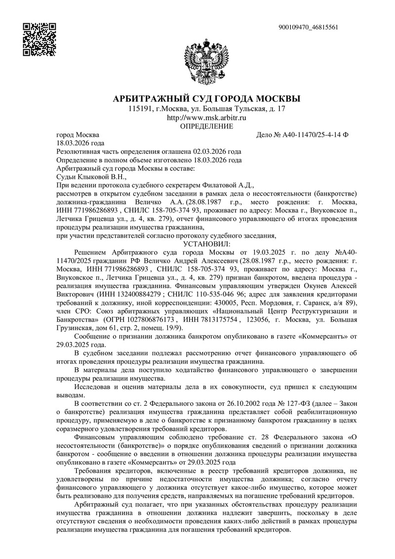Дело № А40-11470/2025 — еще одна успешная история клиента ДОЛГАМ.НЕТ в Арбитражном суде города Москвы. 18.03.2026 судья В.Н. Клыкова вынесла определение о завершении процедуры реализации имущества и освобождении гражданина от дальнейшего исполнения требований кредиторов. Резолютивная часть судебного акта была оглашена 02.03.2026, полный текст изготовлен 18.03.2026.