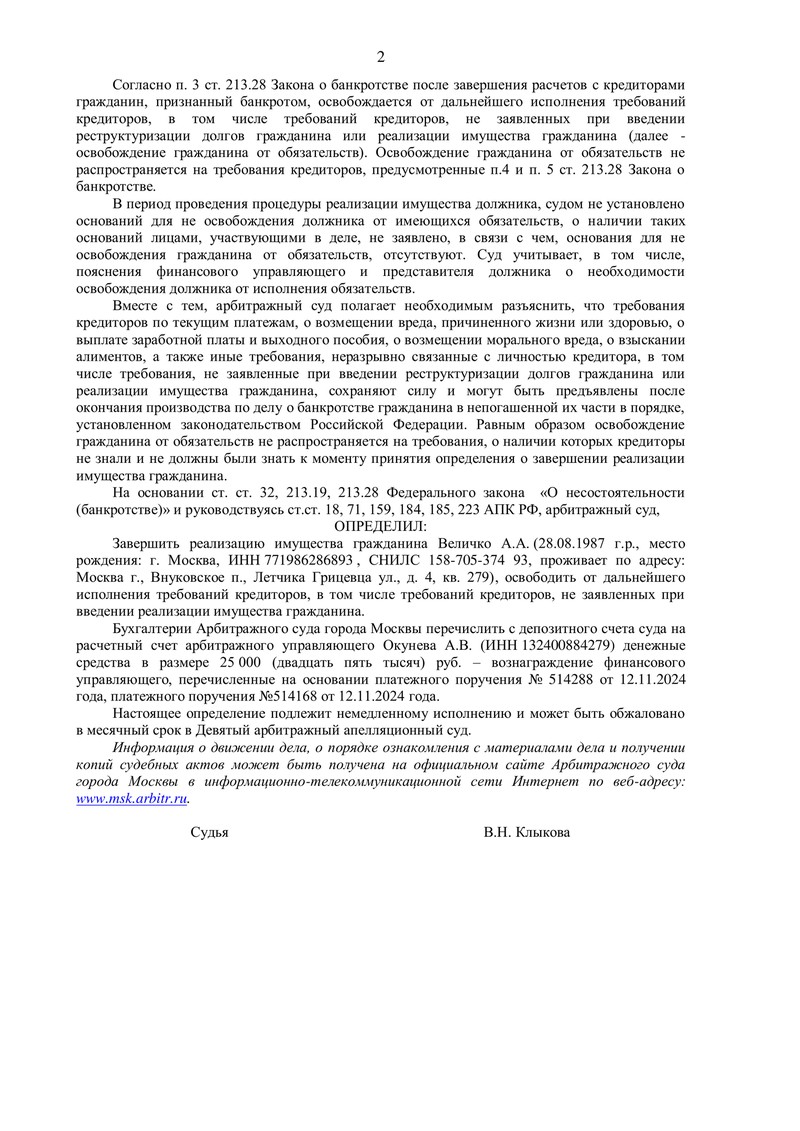 Дополнительно суд определил перечислить с депозитного счета Арбитражного суда города Москвы 25 000 руб. — вознаграждение финансового управляющего (средства были внесены по платежным поручениям от 12.11.2024). Определение подлежит немедленному исполнению и может быть обжаловано в месячный срок в Девятый арбитражный апелляционный суд.