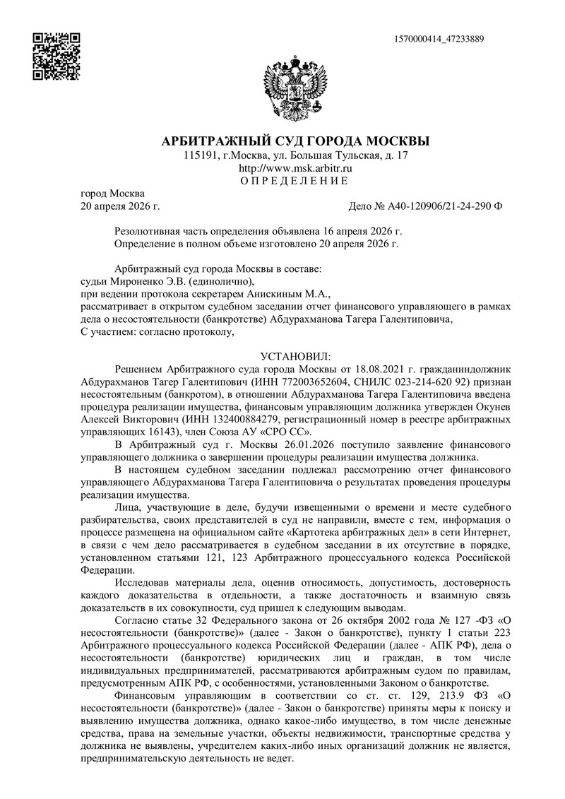 20 апреля 2026 года Арбитражный суд города Москвы (судья Э.В. Мироненко) изготовил в полном объеме определение, которым завершил процедуру реализации имущества в рамках дела о несостоятельности гражданина. Резолютивная часть определения была объявлена 16 апреля 2026 года.