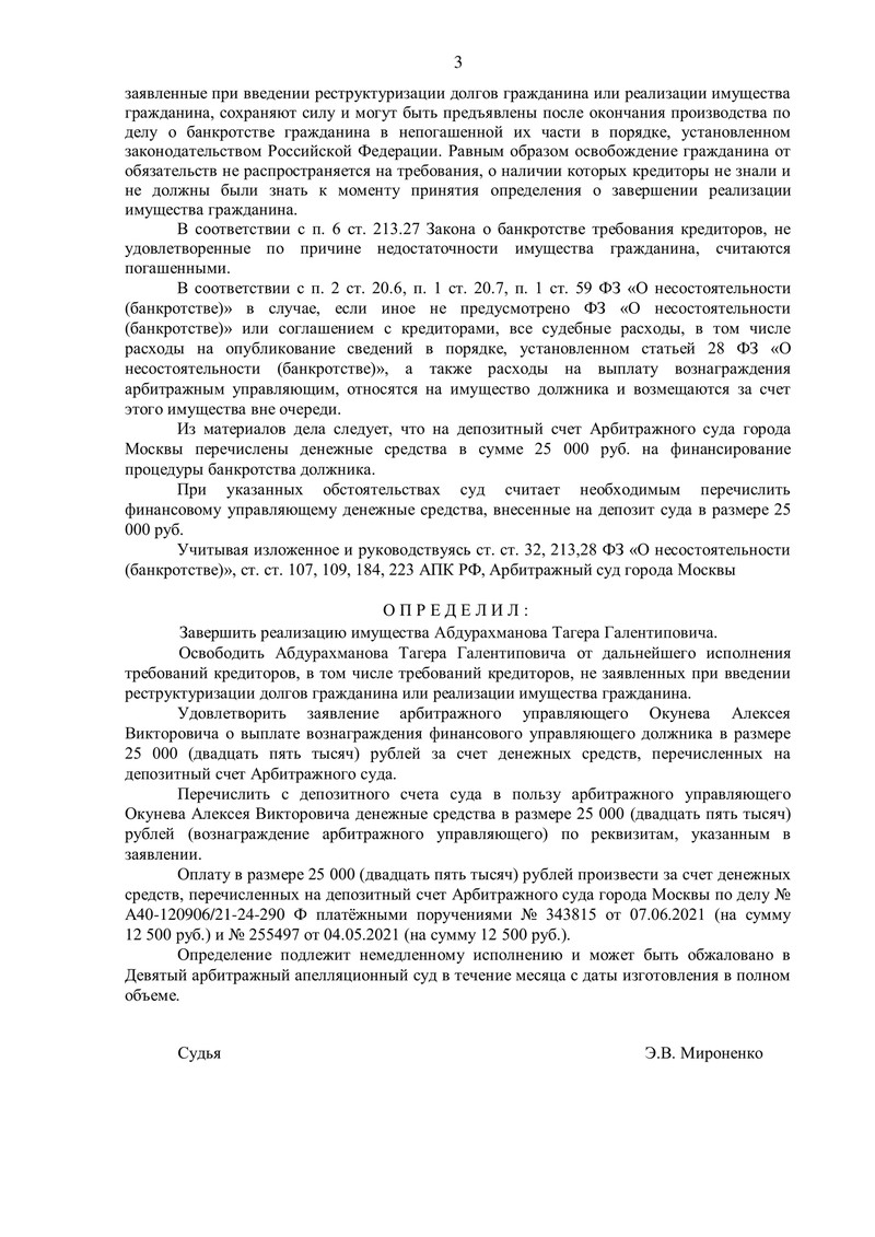 Итог: процедура по делу № А40-120906/2021 завершена, и гражданин получил законное освобождение от долговых обязательств (за исключением требований, которые по закону не списываются, например алиментов, возмещения вреда жизни и здоровью и ряда иных личных требований).